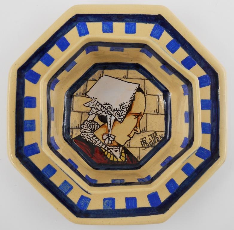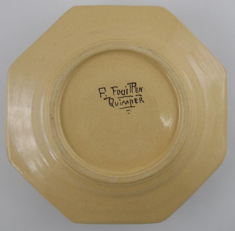 This is illustrated with a Breton lass in the bowl. It is 6-3/4 inches across x 2-1/4 inches deep / tall. Marked on the bottom is "P. Fouillen Quimper" indicating a 1946 - 1985 vintage.