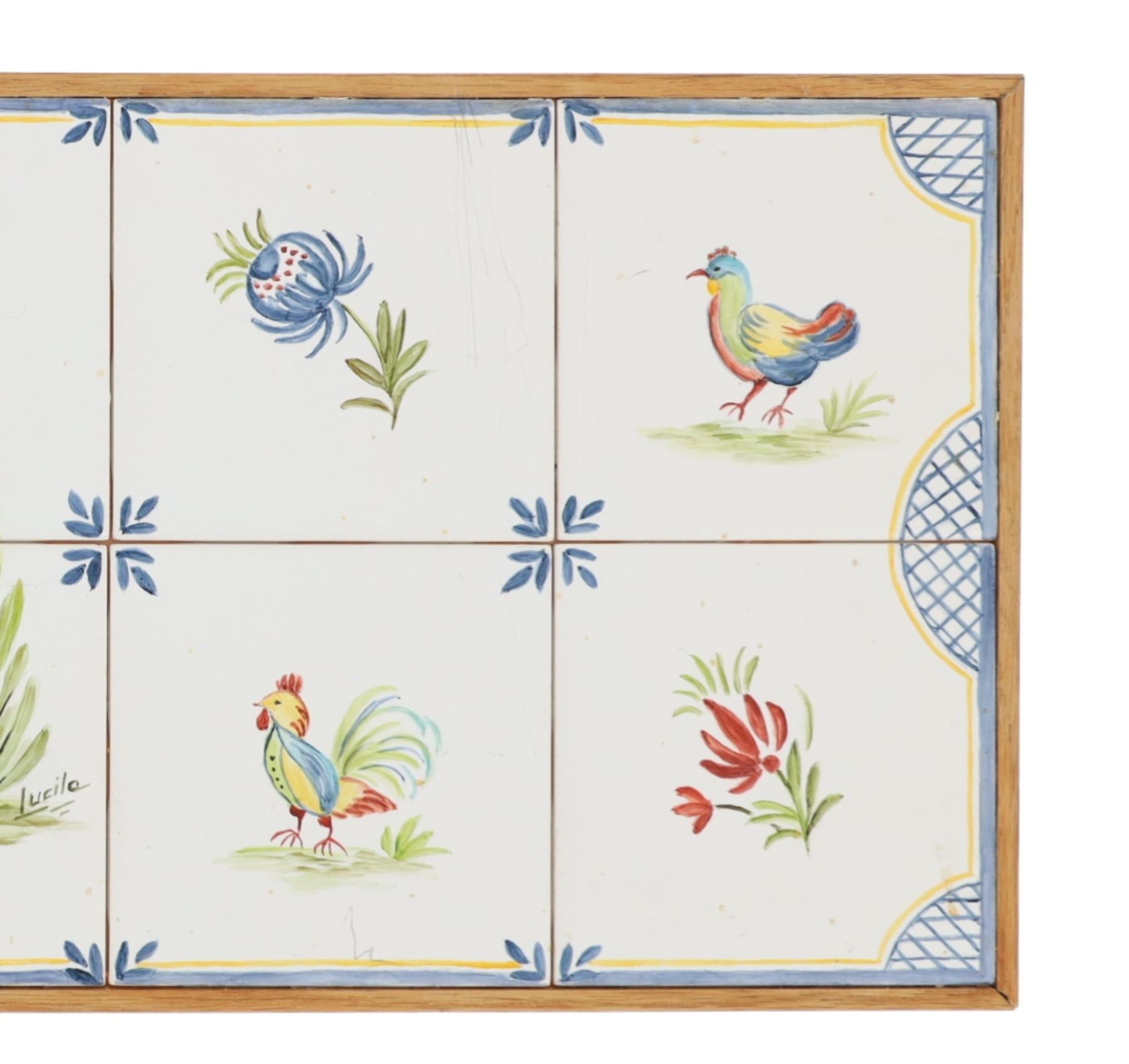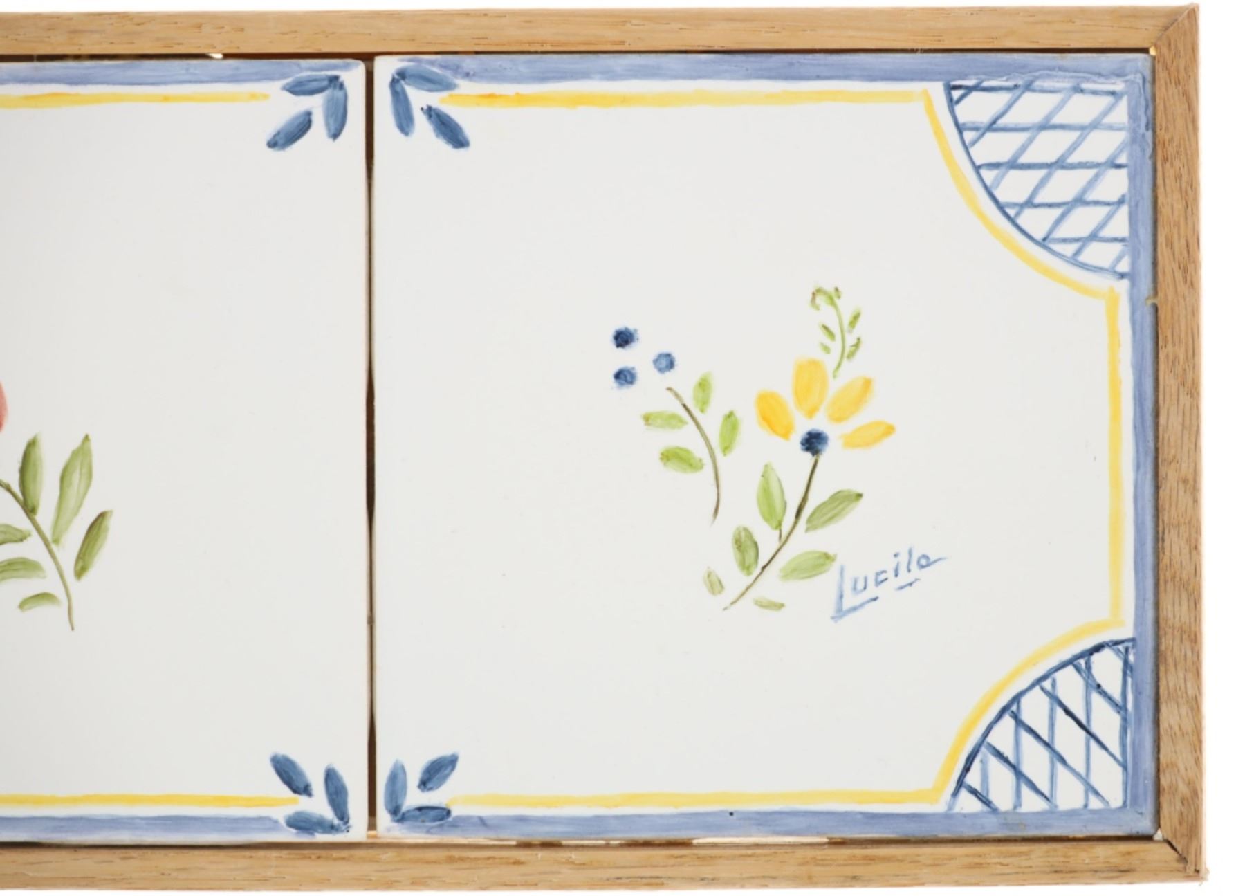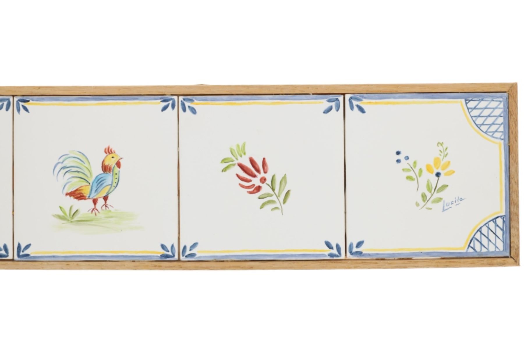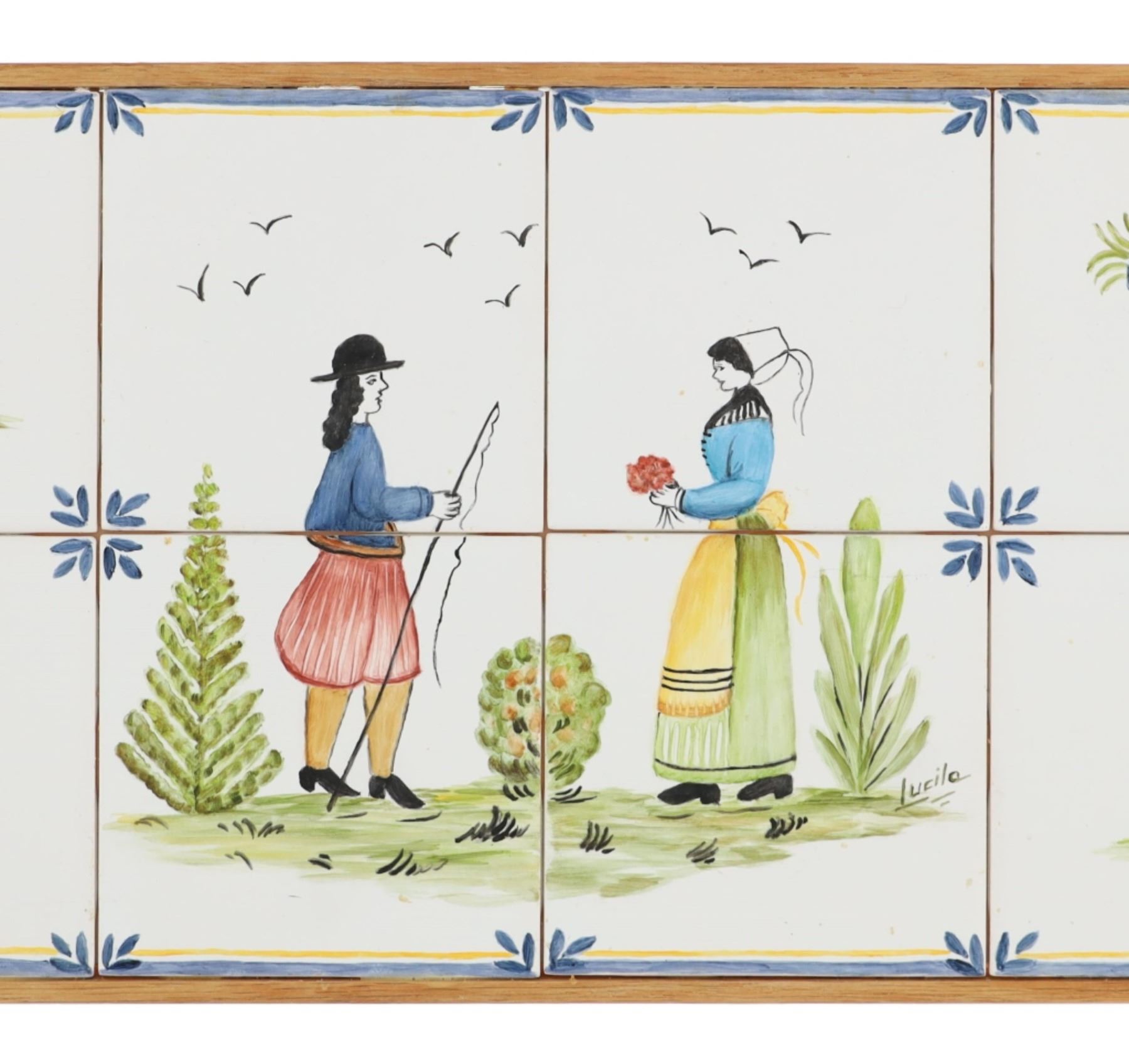 For your consideration are Quimper Faience Wall Art, circa 1980s. Faience or faïence is the term used for fine tin-glazed hand-painted earthenware pottery made in France since the 17th century. The pottery's design reflects a traditional Breton influence. One design, which became typical for Quimper faience, is the "petit breton", a naive representation of Breton man and/or woman in traditional Breton costume. The "petit breton" became popular around 1870. The larger wall art features twelve trivet tiles mounted in a wood frame with the "petit breton" scene centered, signature "Lucile" noted to the right of the female figure. The second piece features eight trivet tiles mounted in a wood frame with floral designs emblematic of the brushstroke pattern Fleuri Royal, signature "Lucile" noted on the far right trivet tile. Trivet tiles on both pieces are mounted on foam backing, sawtooth hangers are attached on the reverse. Wonderfully and professionally made exhibiting both the artistry and expertise that Quimper Faience is known for, in very nice condition. Foam backing has pieces missing but trivet tiles are securely mounted. First piece measures 5"W x 35.75"L x .75"D, second piece is 9.25"W x 26.75"L x .75"D. Combined weight is 8lb, 10oz.