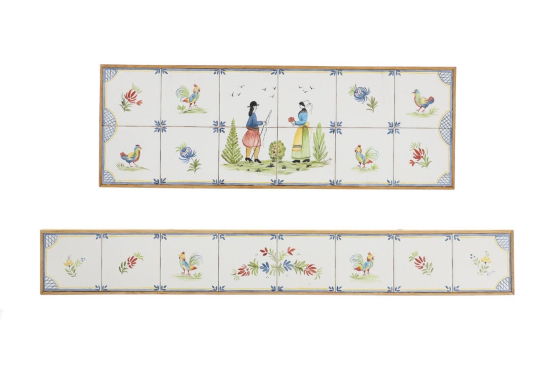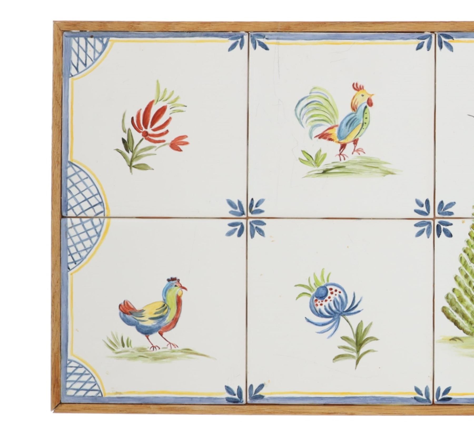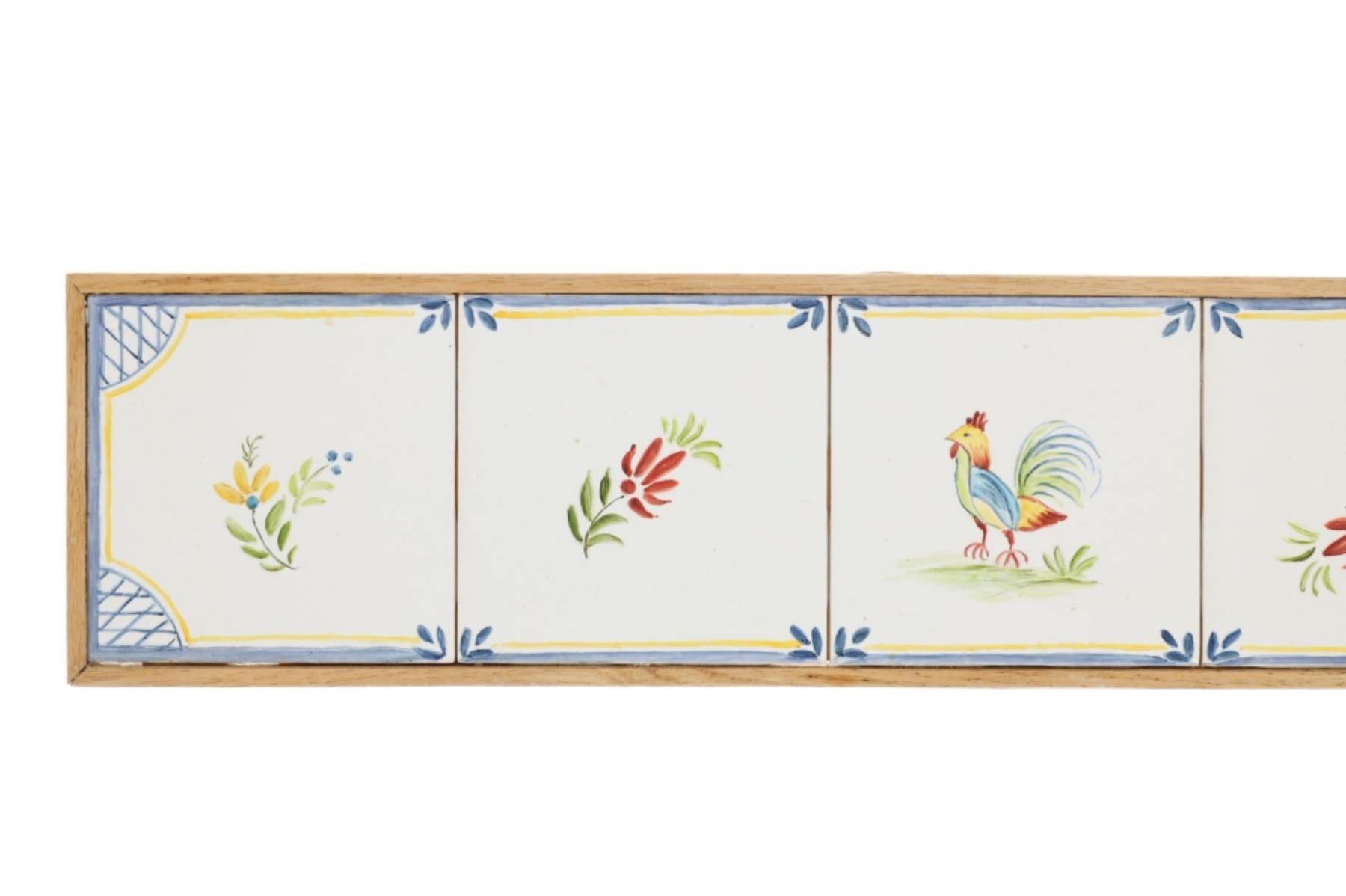 For your consideration are Quimper Faience Wall Art, circa 1980s. Faience or faïence is the term used for fine tin-glazed hand-painted earthenware pottery made in France since the 17th century. The pottery's design reflects a traditional Breton influence. One design, which became typical for Quimper faience, is the "petit breton", a naive representation of Breton man and/or woman in traditional Breton costume. The "petit breton" became popular around 1870. The larger wall art features twelve trivet tiles mounted in a wood frame with the "petit breton" scene centered, signature "Lucile" noted to the right of the female figure. The second piece features eight trivet tiles mounted in a wood frame with floral designs emblematic of the brushstroke pattern Fleuri Royal, signature "Lucile" noted on the far right trivet tile. Trivet tiles on both pieces are mounted on foam backing, sawtooth hangers are attached on the reverse. Wonderfully and professionally made exhibiting both the artistry and expertise that Quimper Faience is known for, in very nice condition. Foam backing has pieces missing but trivet tiles are securely mounted. First piece measures 5"W x 35.75"L x .75"D, second piece is 9.25"W x 26.75"L x .75"D. Combined weight is 8lb, 10oz.