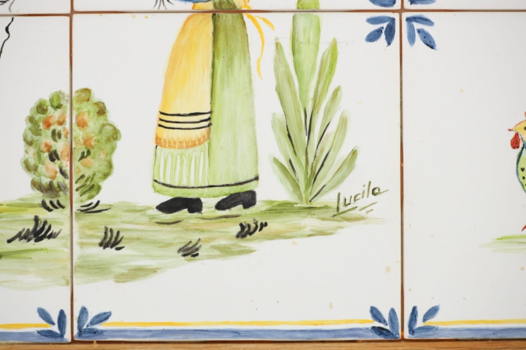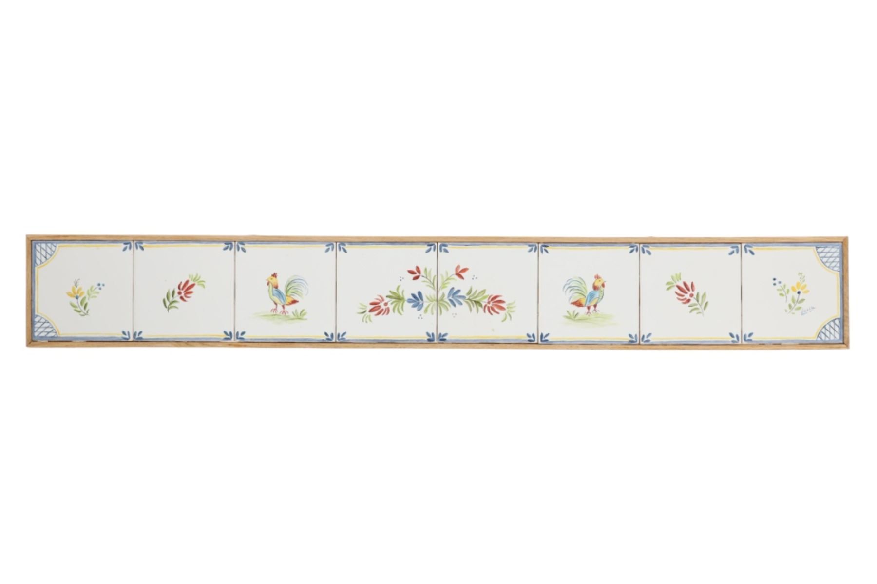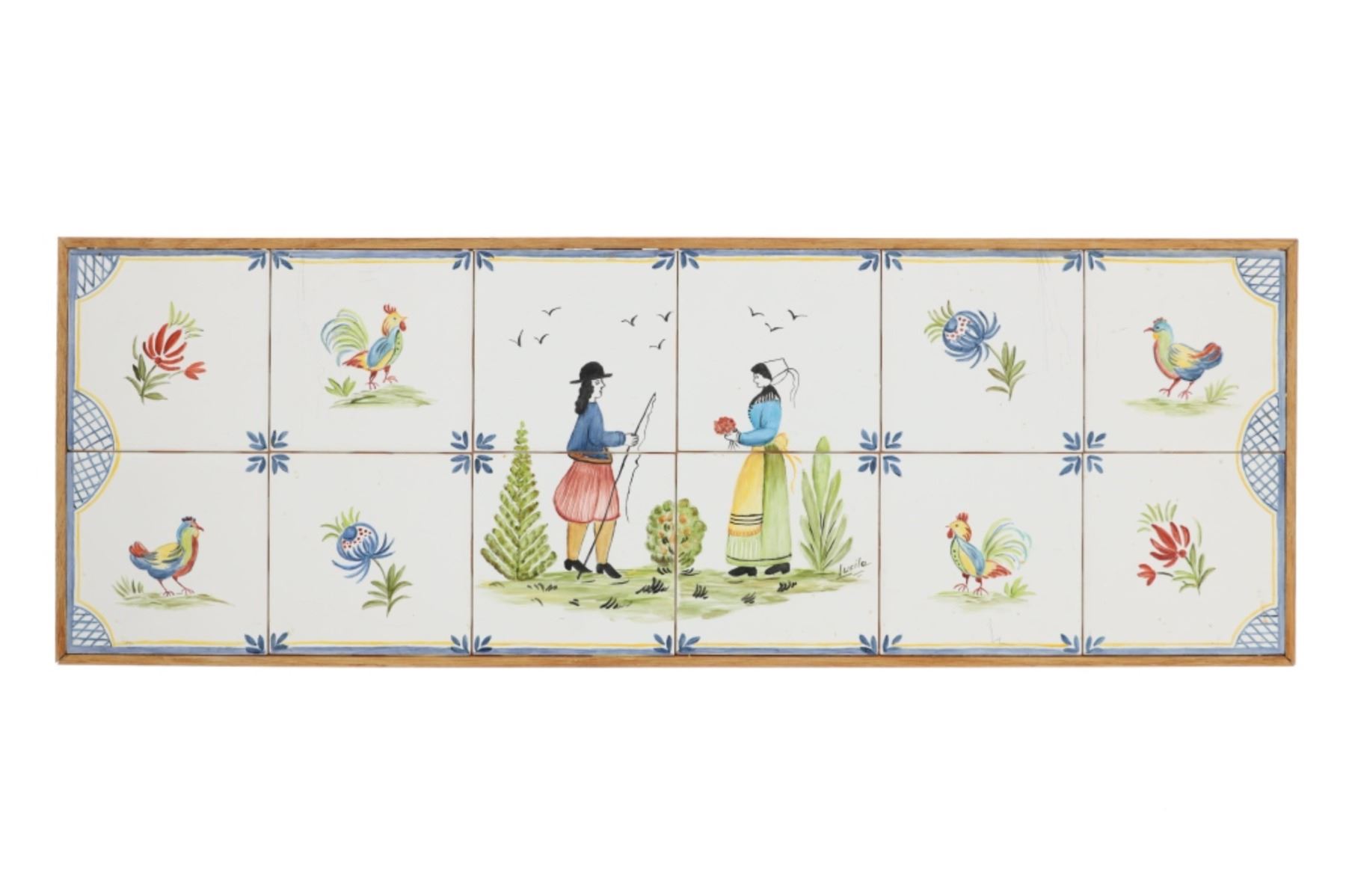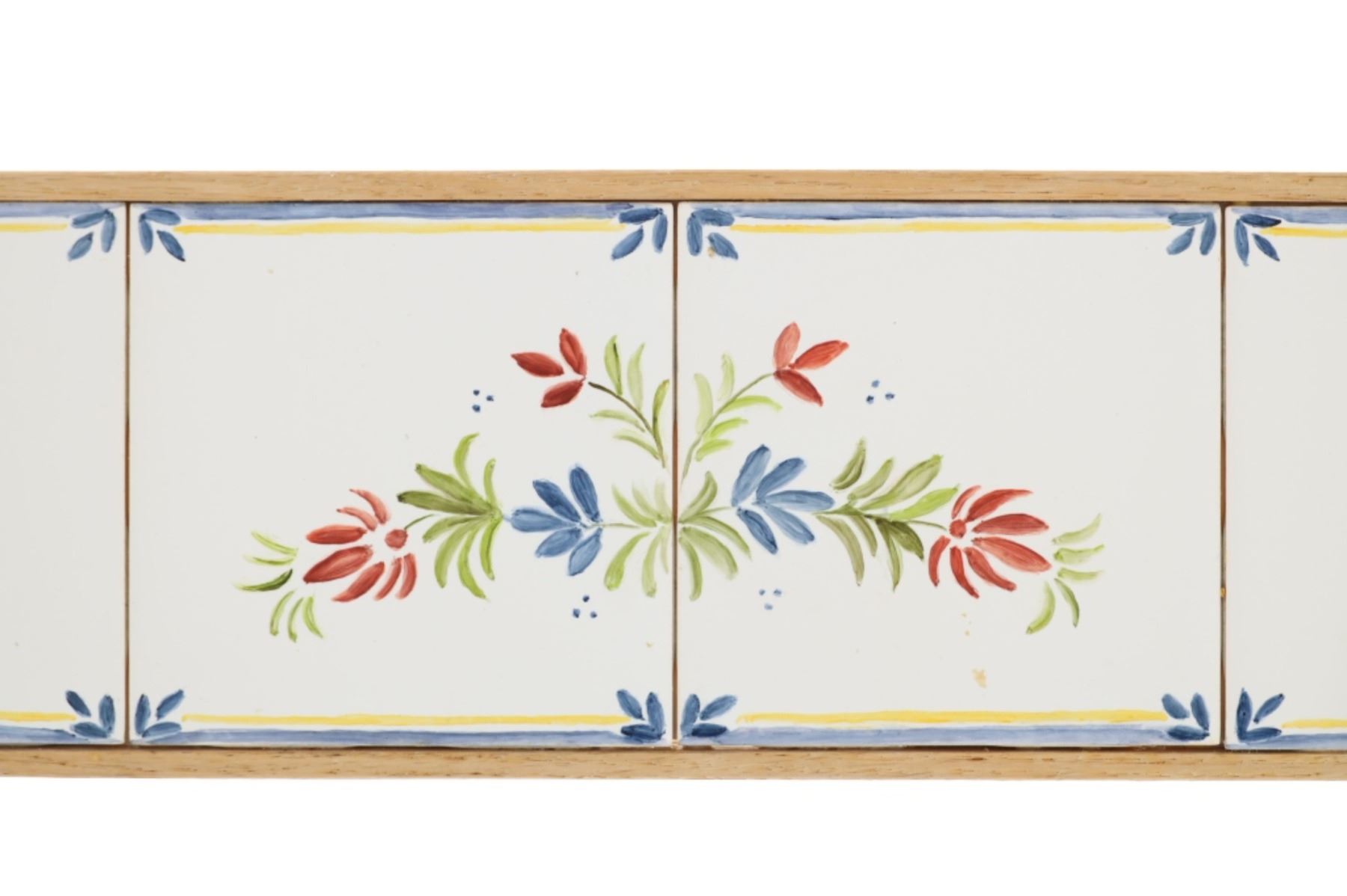 For your consideration are Quimper Faience Wall Art, circa 1980s. Faience or faïence is the term used for fine tin-glazed hand-painted earthenware pottery made in France since the 17th century. The pottery's design reflects a traditional Breton influence. One design, which became typical for Quimper faience, is the "petit breton", a naive representation of Breton man and/or woman in traditional Breton costume. The "petit breton" became popular around 1870. The larger wall art features twelve trivet tiles mounted in a wood frame with the "petit breton" scene centered, signature "Lucile" noted to the right of the female figure. The second piece features eight trivet tiles mounted in a wood frame with floral designs emblematic of the brushstroke pattern Fleuri Royal, signature "Lucile" noted on the far right trivet tile. Trivet tiles on both pieces are mounted on foam backing, sawtooth hangers are attached on the reverse. Wonderfully and professionally made exhibiting both the artistry and expertise that Quimper Faience is known for, in very nice condition. Foam backing has pieces missing but trivet tiles are securely mounted. First piece measures 5"W x 35.75"L x .75"D, second piece is 9.25"W x 26.75"L x .75"D. Combined weight is 8lb, 10oz.
