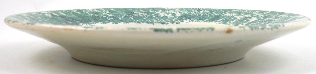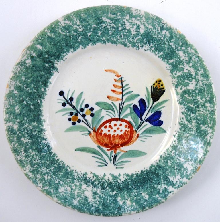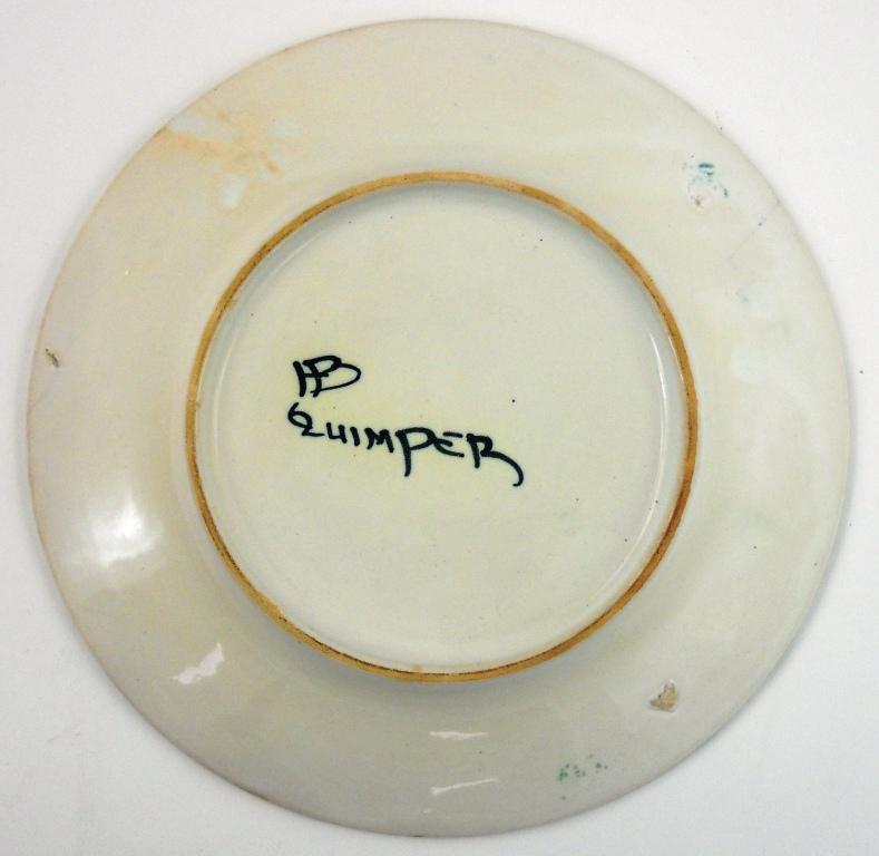 This plate has a sponged border and flowers in center. It is 6-5/8 inches in diameter. Marked on the bottom is "HB QUIMPER" indicating a 1904 - 1968 vintage. There are flea bites on the rim, which is common for Quimper.