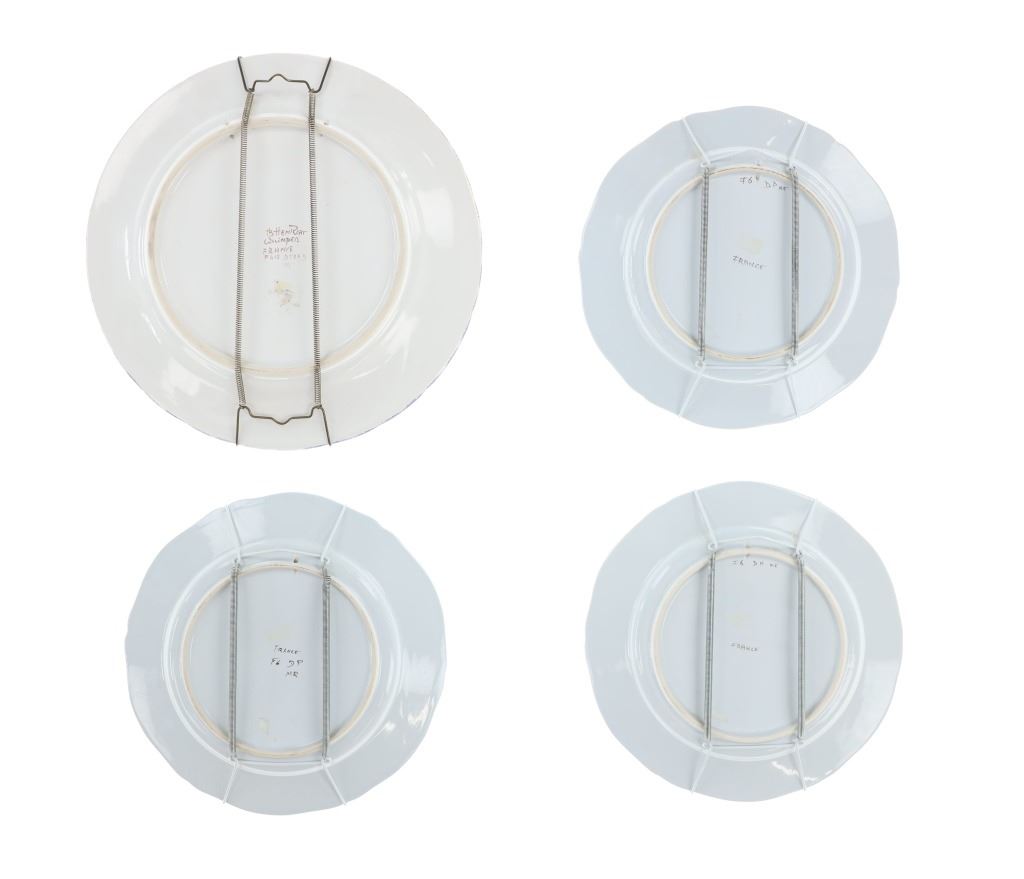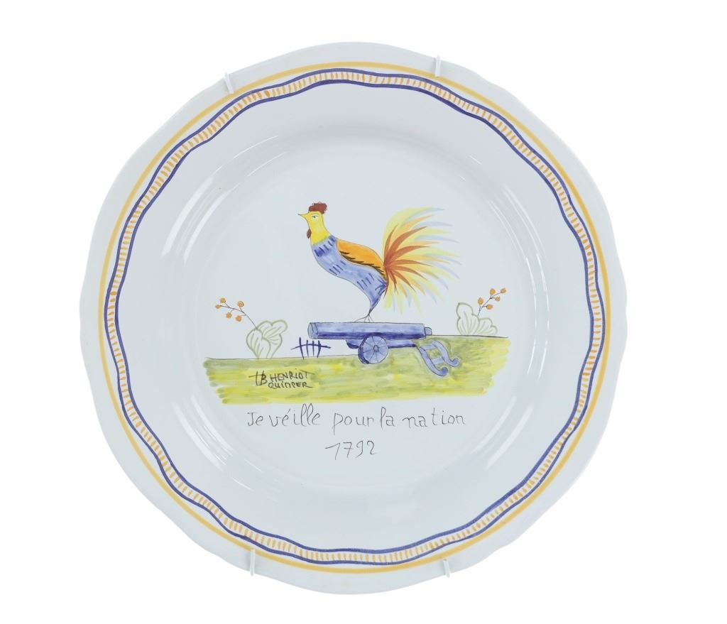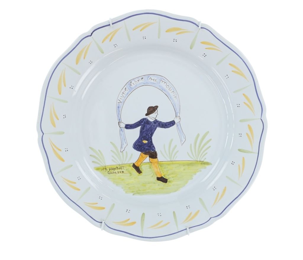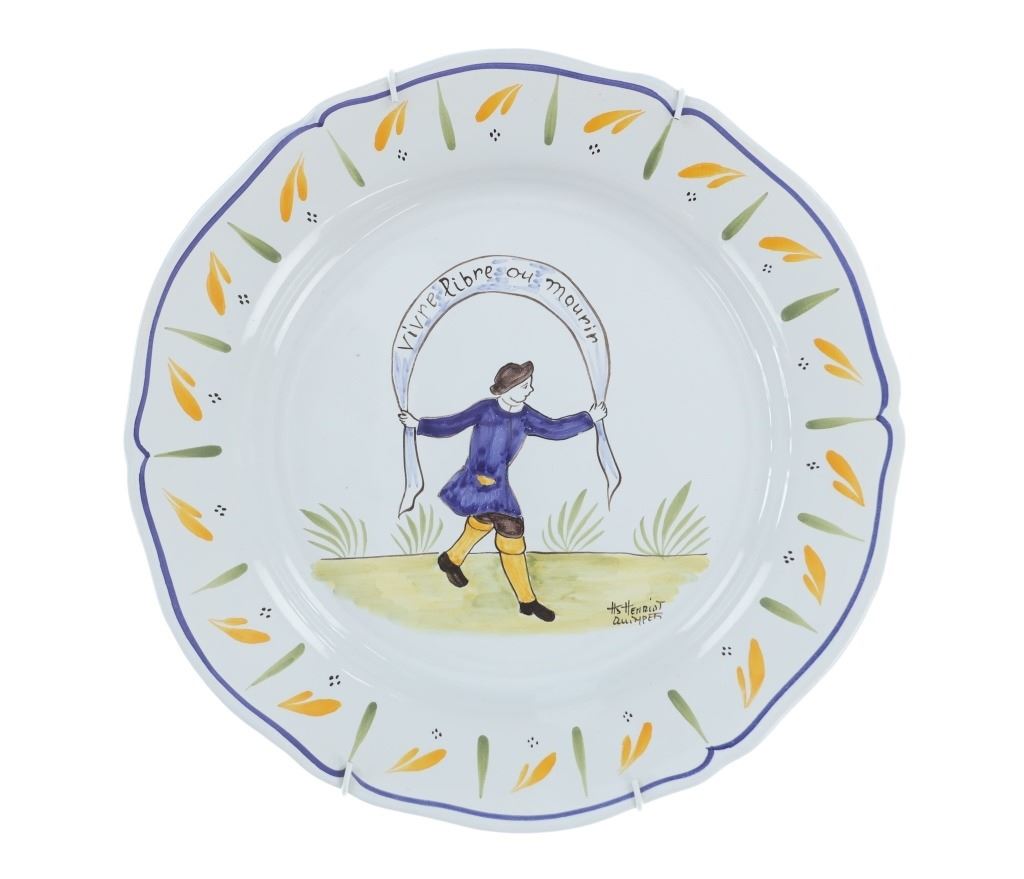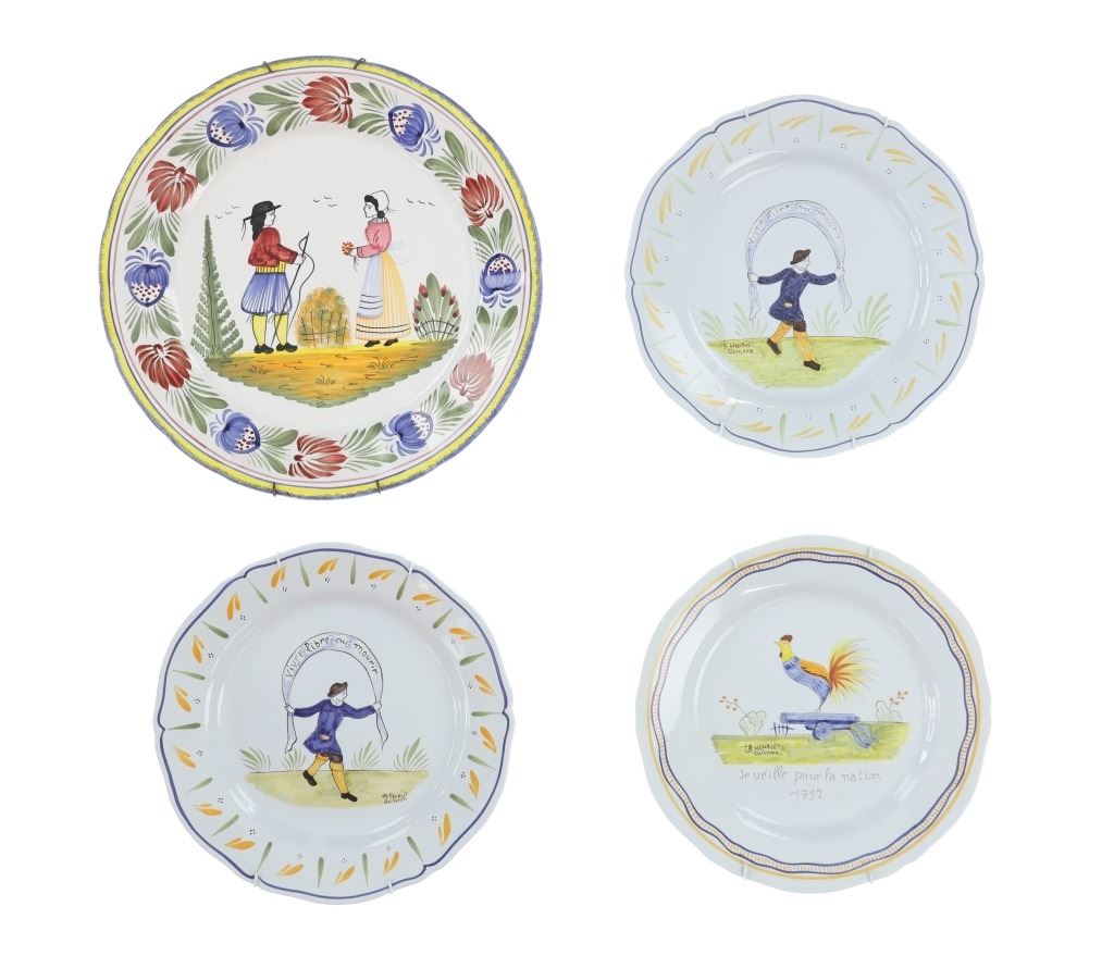 For your consideration is a set of four, French hand painted decorative faience plates done by Quimper Pottery in Brittany, France in the 1940s-50s. Faience operations were started by Jean-Baptiste Bousquet, a potter from Marseille, in 1690 and were carried on by his descendants. One descendant, Antoine de la Hubeaudière, left his name on the business: La Grande Maison HB. This set features three plates and a serving platter, all hand painted with bright and colorful farm scenes. The platter shows a scene between a man and a woman. Two plates show a man dancing with a large ribbon over his head reading, "Vivne libre au mourir". The final plate shows a chicken riding a small farm tool with the plate reading, "Je veille pour la nation 7792". All of the plates are signed reading, "Henriot Quimper". They shows good condition overall with little to no wear present. They measure from 12 1/2" L x 12 1/2" W to 10 1/4" L x 10 1/4" W. They have a collective weight of 5 pounds and 6 ounces.