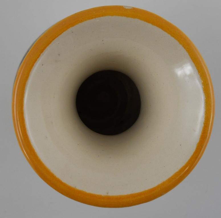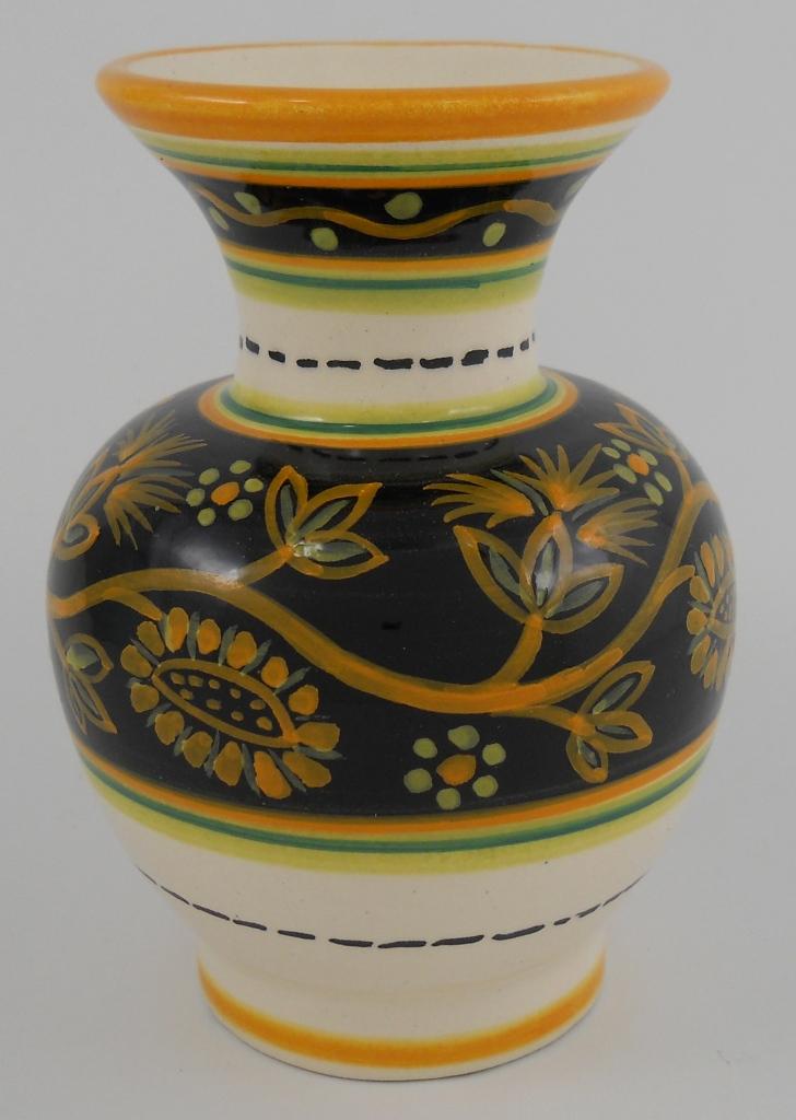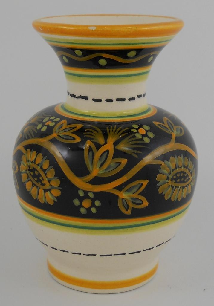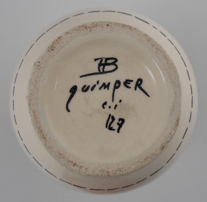 This vase is 5-1/2 inches tall x 3-3/4 inches in diameter at the widest point. Marked on the bottom is "HB quimper c.i. 127". There is a flea bite on the rim, which is very common for Quimper.
