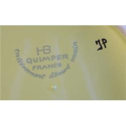 Quimper cake plate with serving knife. Measures 11" in dia. and knife is 6" long. Marked on bottom Quimper France and artist JP initials.