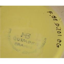 Quimper double handled covered bean pot. Measures 7" tall and 9" from handle to handle. Marked on bottom Quimper France and F.01 D.201 and artist CG initials.