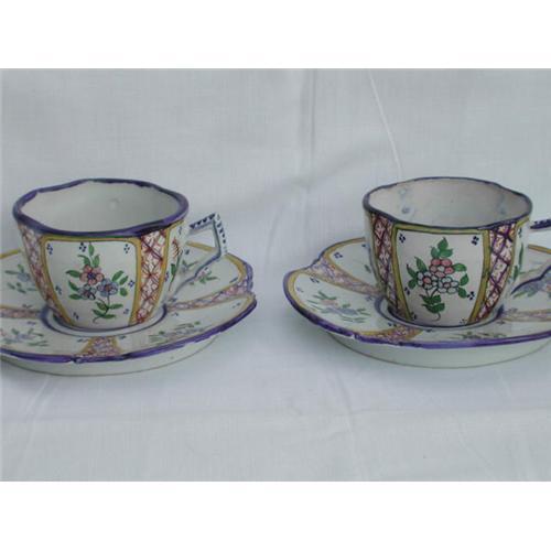 Quimper 4 sided cup with saucer and having a hand painted design. There are two sets, price is for one cup and saucer.Signed HB