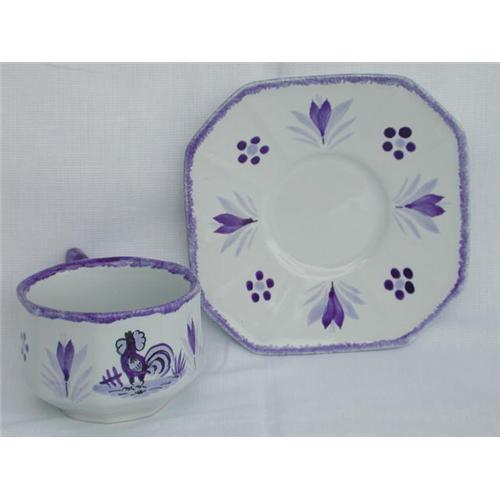 Quimper 8 sided cup and saucer with crowing rooster painted on cup in cobalt blue painting. Excellent condition by HB