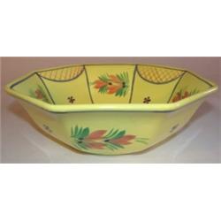 Quimper octagonal serving bowl. Measures 8 3/4" in dia. Marked on bottom "Hg. Henriot-Quimper France" and F.303-D.307 and artist PF initials.