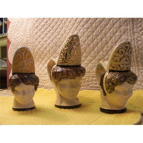 very rare Quimper pitcher , head of britain women shape , in gold black and of white . signed henriot quimper from the 1925 period . two of them are 7" high and there is a taller one 8" high . beatifull , hard to find and perfect condition too . a must .