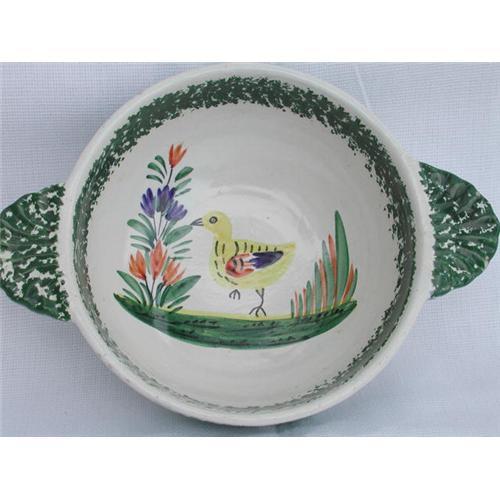 Quimper two handled bowl or porringer in green and yellow with chickens.Signed HB