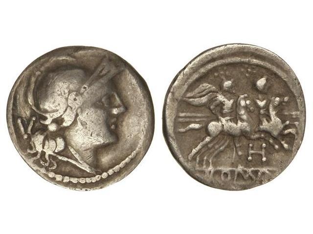 Quinario. 187-155 a.C. ANÓNIMO. CON MONOGRAMA. Rev.: Dióscuros a caballo a derecha, debajo H. En exergo: ROMA. S-33.B. MBC.