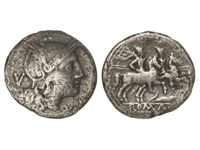 Quinario. 211-210 a.C. ANÓNIMA-21B. Rev.: Dioscuros a caballo a derecha. Debajo espiga. En exergo: ROMA. 1,80 grs. MBC-.
