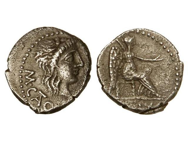 Quinario. 89 a.C. PORCIA. M. Porcius Cato. Anv.: M. CATO. Busto de Libertad a derecha. Rev.: (VICTRIX). Victoria Sedente. Se-248. MBC+.
