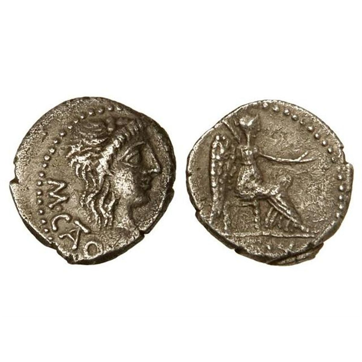 ROMAN COINS: ROMAN REPUBLIC - Quinario. - 89 a.C. - PORCIA. - M. Porcius Cato. - Anv.: M. CATO. Busto de Libertad a derecha. Rev.: (VICTRIX). Victoria Sedente. Se-248. MBC+. - -