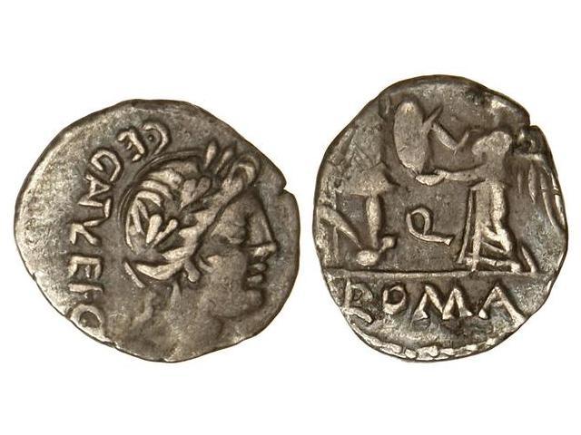 Quinario. 97 a.C. EGNATULEIA. Anv.: Cabeza de Apolo. Rev.: Victoria y trofeo. En exergo: ROMA. Craw-333/1. MBC.
