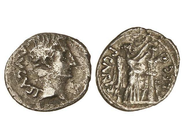 Quinario. ÉPOCA DE AUGUSTO. EMERITA AUGUSTA. Anv.: AVGVST. Cabeza de Augusto a derecha. Rev.: P. CARISI. LEG. Victoria coronando un trofeo. 1,60 grs. AR. (Oxidaciones). AB-982. MBC.