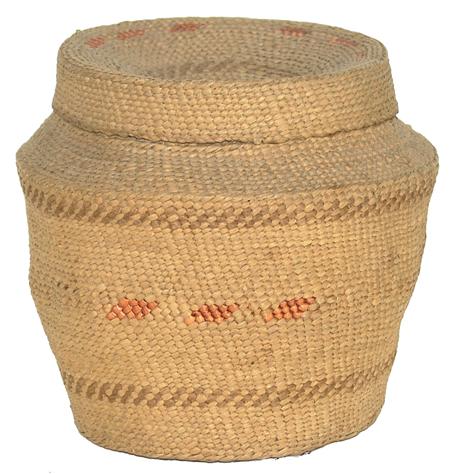 Circa Early 1900s, Interesting shaped lidded basket done in fine half twist weave with some color designs. Very good condition. 6" x 7"