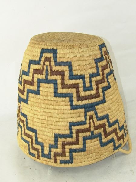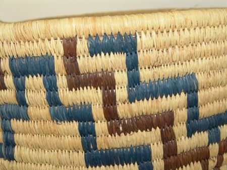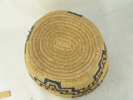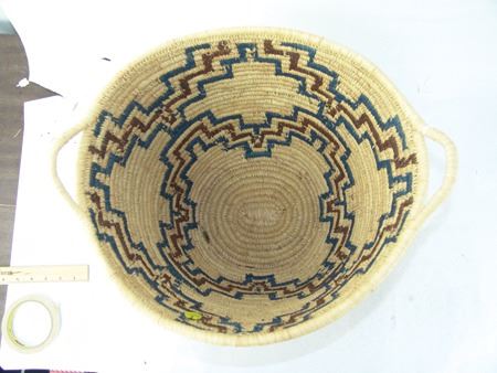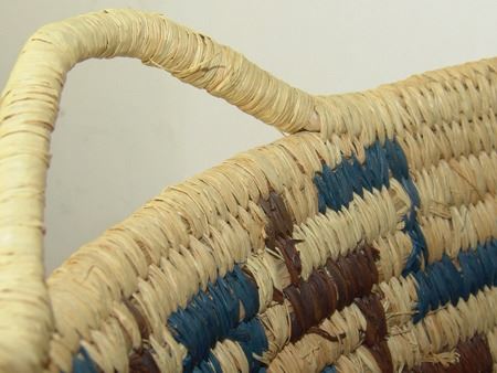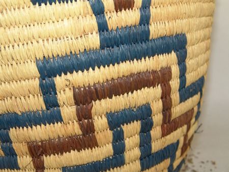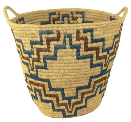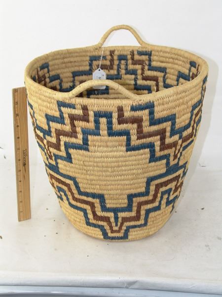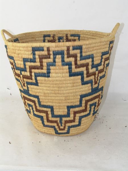 Ca. 1970s, Large and colorful woven raffia storage basket with striking geometric designs. Very good condition. 16" x 14-1/2"
