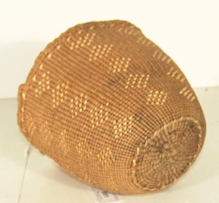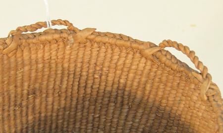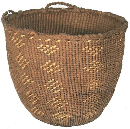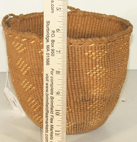 Classic reverse design basketry bowl with imbricated elements and 2 woven handles. Condition: excellent. 5-1/2" high x 7" diameter.