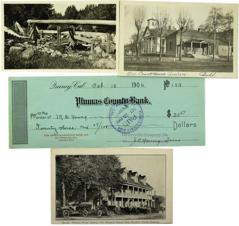 Lot includes three postcards and 1 Plumas County Bank Check. The check is datelined Quincy, CA. Check number 128 for $23.67 on 16 October 1906 is made out to M. . . . Young and signed by J. C. Young of the Taylorsville Creamery Co. The name of the bank is The Anglo-California Bank Ltd. of San Francisco. The check has an oval blue paid stamp on it - dated 26 October 1906.