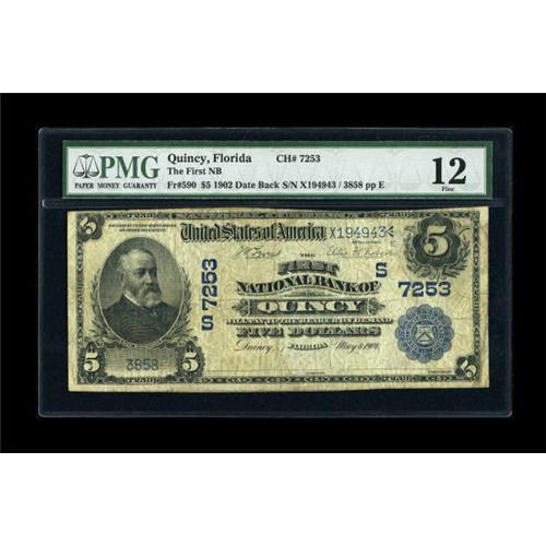 <B>Quincy, FL</B></I> - $5 1902 Date Back Fr. 590 <B>The First NB</B></I> Ch. # (S)7253<BR> A very scarce note from a bank which issued large examples only and was this small community's only issuer. Although several notes from this location are listed in the census, Track and Price shows no offerings of any kind from Quincy since an auction appearance nearly two decades ago. PMG <B>Fine 12.</B></I> <BR><I>From The Sunshine State Collection.</B></I><BR><BR><b>Shipping:</b> Coins & Currency (<a target="_blank" href="http://www.heritageauctions.com/common/shipping.php">view shipping information</a>)