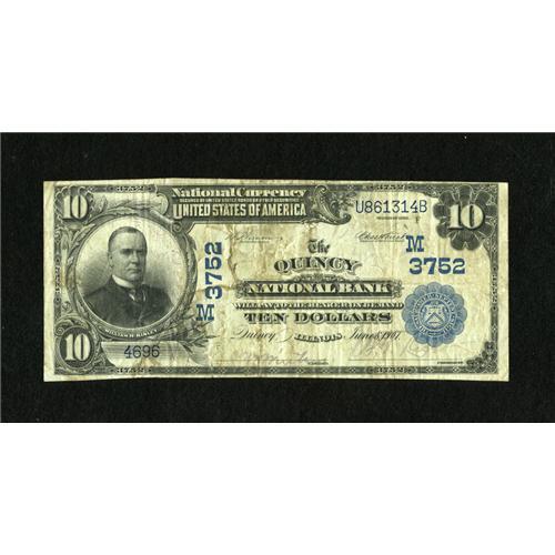 <B>Quincy, IL</B></I> - $10 1902 Plain Back Fr. 626 <B>The Quincy NB</B></I> Ch. # (M)3752<BR>Some minor staining and an edge split are noted, but sound much worse than they appear. <B>Fine.</B></I><BR><I>From The Lincoln Collection</B></I><BR><BR><b>Shipping:</b> Coins & Currency (<a target="_blank" href="http://www.heritageauctions.com/common/shipping.php">view shipping information</a>)