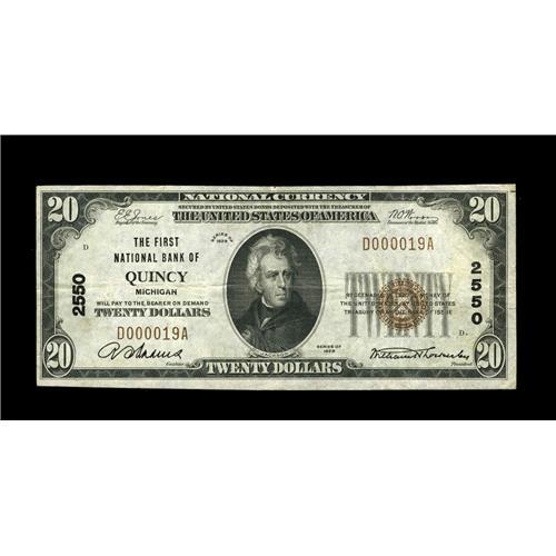 <B>Quincy, MI</B></I> - $20 1929 Ty. 1 <B>The First NB</B></I> Ch. # 2550<BR>A very tough note from the only bank to issue in this Branch County location. This piece is as nice as any example, large or small, we've ever encountered from here. <B>Very Fine-Extremely Fine,</B></I> with a tiny margin split that affects nothing.