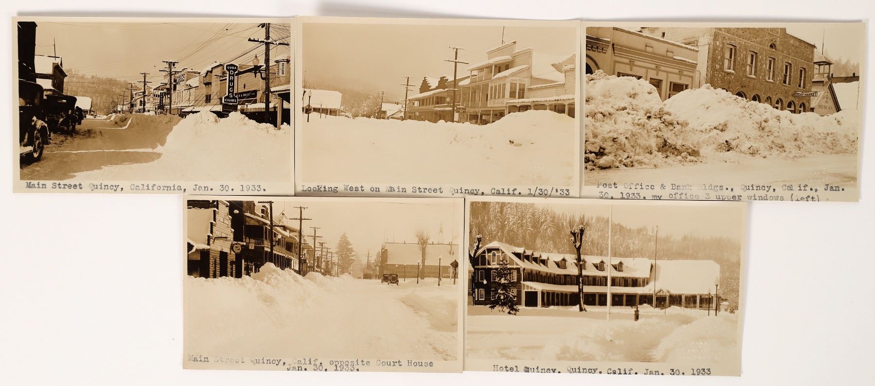 Lot of 5. RPPC's, wht border. Endorsed with embossed "Rabe Quincy Calif." Descriptions have been typewritten on the photo bottom border. No writing on any of them. In protective sleeves. All the scenes were taken Jan 1933, lots of snow of Main st., Post Office, looking west. Hotel Quincy. California Quincy 1933 Ken Prag Collection