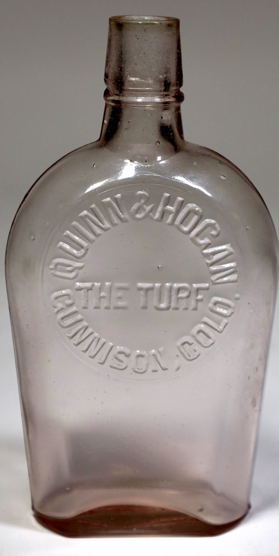 Identical to Preble W-98, but an unlisted size variety. Quinn & Hogan / The Turf / Gunnison, Colo. Half pint shoo fly flask, wiped top, 6 1/8", very faint purple tint. Small chips along the rim of base on front and back, bubbles. Please inspect.
