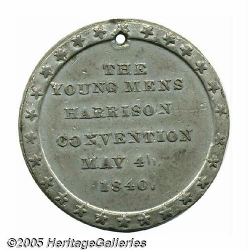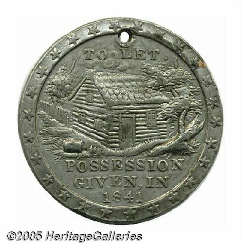 <B>Quintessential William Henry Harrison Campaign Medal</B></I> This is the best Harrison medal produced for the campaign of 1840, Sullivan-DeWitt WHH 1840-1, 45 mm. The unique and bold design shows a high-relief log cabin on the obverse, inscribed "To Let, Possesion Given in 1841." The reverse states "The Young Men's Harrison Convention May 4th 1840." The raised rims are encircled by stars. Obviously rare (issued for a one-day event), copies, when offered, typically are well-worn. This specimen grades extremely fine with only minor wear on the highlights and some reflective surfaces, especially on the reverse. The McSorley example, in slightly better grade, realized $1,100. Lot:256