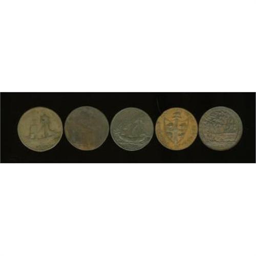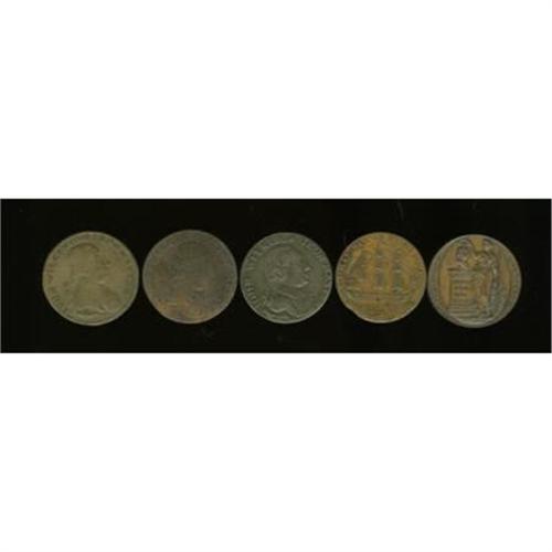 <B>Quintet of British Warwickshire Conder Tokens.</B></I> Group lot of five British Warwickshire Conder tokens, uncertified. Includes: DH-336, 1788; DH-439, 1791; DH-339, 1792; DH-59a, 1794; DH-122e, 1795. The average grade is XF40. <BR><BR><b>Shipping:</b> Coins & Currency (<a target="_blank" href="http://www.heritageauctions.com/common/shipping.php">view shipping information</a>)