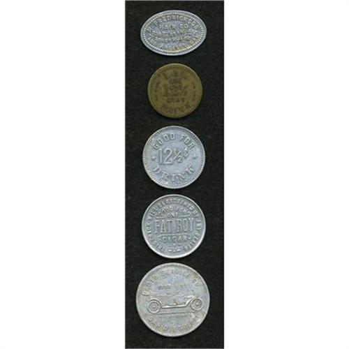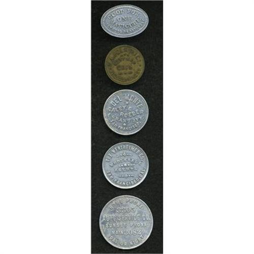 <B>Quintet of California Merchant Tokens.</B></I> Brass/aluminum. Includes Kappen catalog numbers<B> LA-396; SD-13; SF-666; </B></I>and two unlisted tokens, <B>The Wertheimer Co. S.F., </B></I>similar to Kappen 2729,<B> </B></I>and <B>M. L. Polaski, Los Angeles, </B></I>similar to LA-862.<BR><BR><b>Shipping:</b> Coins & Currency (<a target="_blank" href="http://www.heritageauctions.com/common/shipping.php">view shipping information</a>)