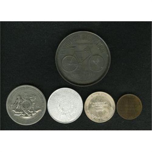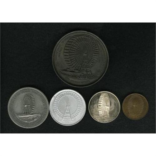 <B>Quintet of Ferris Wheel Medals and Tokens.</B></I> Medals and tokens related to the world-famous Ferris Wheel, including a large (69-mm) white metal piece issued by Rambler Bicycles of Chicago; a 50-mm medal issued by the Tandem Smelting Co., London; and a couple of others. <BR><BR><b>Shipping:</b> Coins & Currency (<a target="_blank" href="http://www.heritageauctions.com/common/shipping.php">view shipping information</a>)