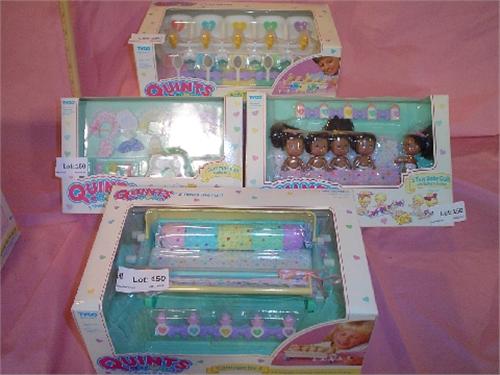 "Quints" by Tyco. 4 Boxes: Bathtime for 5 Tub Set #1570-1, Dolls Set #1554, Summer Fun Outfits for 5 #1560-1, Carriage For 5 Carriage Set #1575-1. All new. MIB
