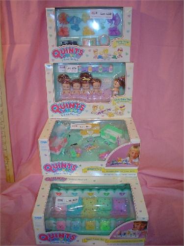 "Quints" by Tyco. 4 Boxes: Bedtime For 5 #1570-2, Wagon For 5 Wagon Set #1575-3, 5 Tiny Baby Dolls w/Bottles & Bunting #1550-2, Party Time Outfits For 5 #1560-2. All new. MIB