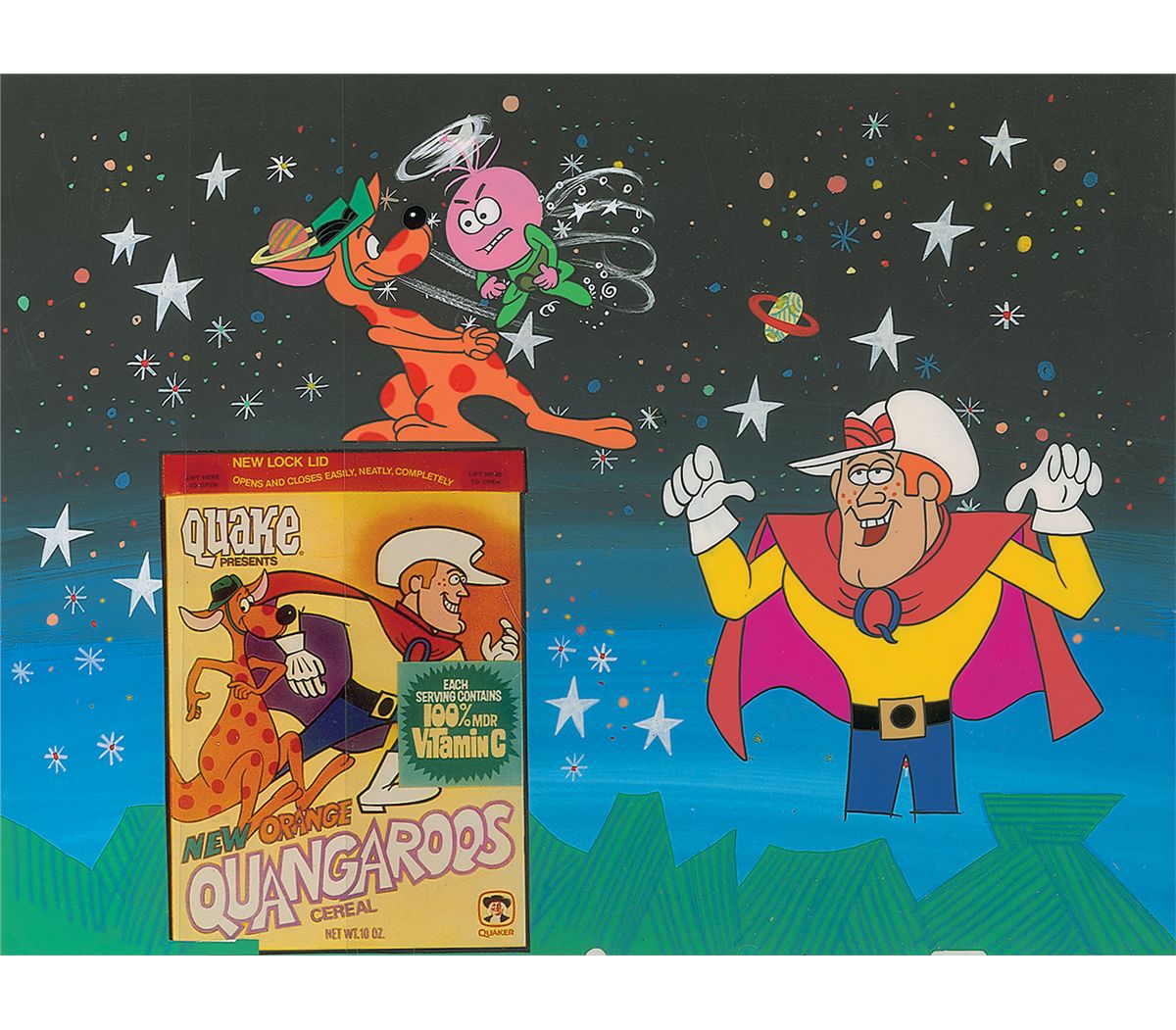 (Jay Ward, Circa 1970s) Original production key master cel and background setup featuring Quisp, Quake, and Quangaroos from a Quisp, Quake, and Quangaroos television commercial. Image of Quake measures 5 x 4.75, image of Quisp and Quangaroos measures 4 x 3.75, with an overall size of 13.75 x 11, with a clipped 4 x 5.5 cereal box cover affixed to the background. In fine condition. Ward is perhaps best known for his work on Rocky and Bullwinkle, Peabody and Sherman, and Dudley Do-Right. A scarce piece from one of the joint commercials featuring all three of the Quaker cereal products.