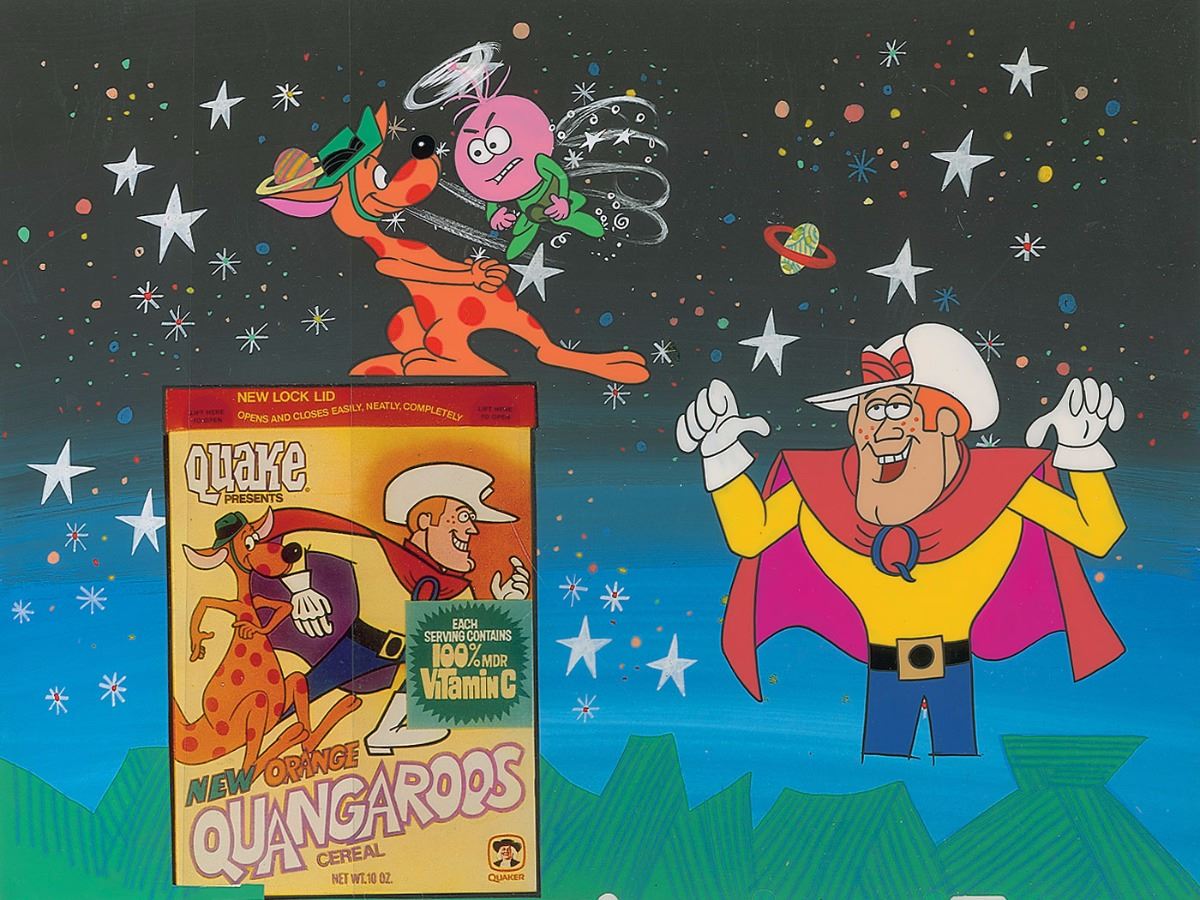 (Jay Ward Productions, circa 1970s) Original production key master cel and background setup featuring Quisp, Quake, and Quangaroos from a Quisp, Quake, and Quangaroos television commercial. Image of Quake measures 5 x 4.75, image of Quisp and Quangaroos measures 4 x 3.75, with an overall size of 13.75 x 11, with a clipped 4 x 5.5 cereal box cover affixed to the background. In fine condition. Ward is perhaps best known for his work on Rocky and Bullwinkle, Peabody and Sherman, and Dudley Do-Right. A scarce piece from one of the joint commercials featuring all three of the Quaker cereal products.