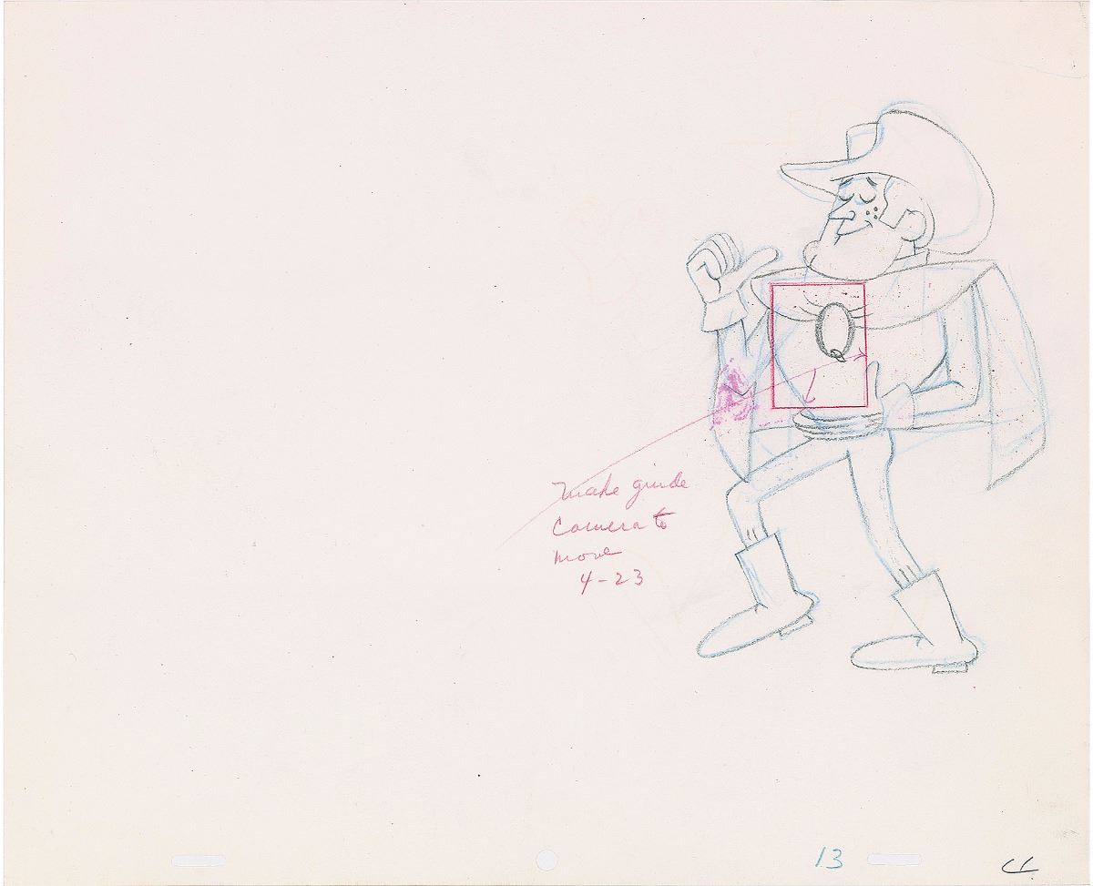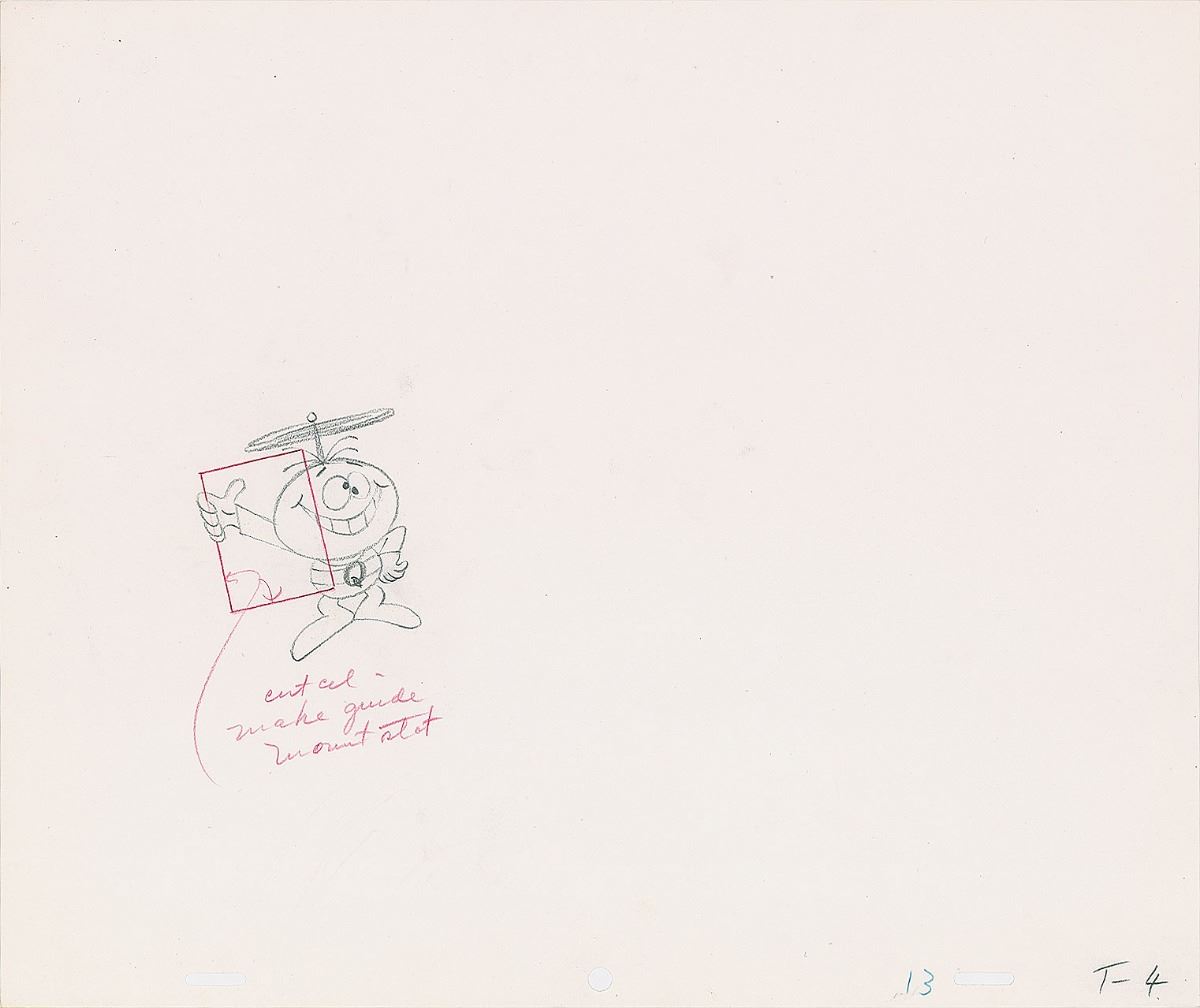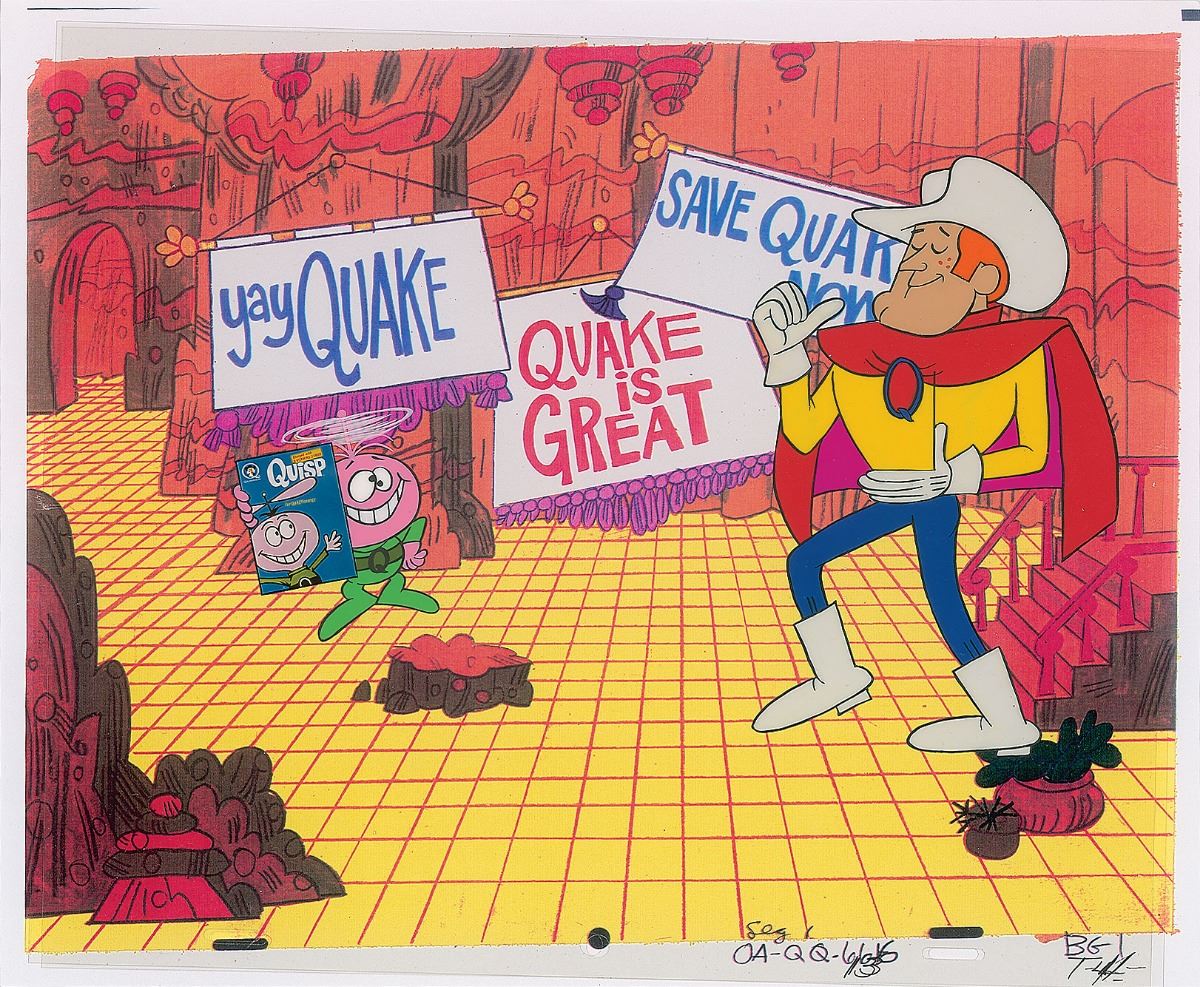 (Jay Ward Productions, 1970s) Original production cels and matching drawings of Quisp and Quake from a breakfast cereal TV commercial, showing the two characters in a psychedelic room with banners promoting Quake. The cels are placed on a matching studio copy background. Images measure 2.25 x 2.5 (Quisp) and 4.25 x 6.75. The matching drawings are accomplished in graphite and colored pencil on individual sheets of 12.5 x 10.5 animation paper. In overall fine condition.
