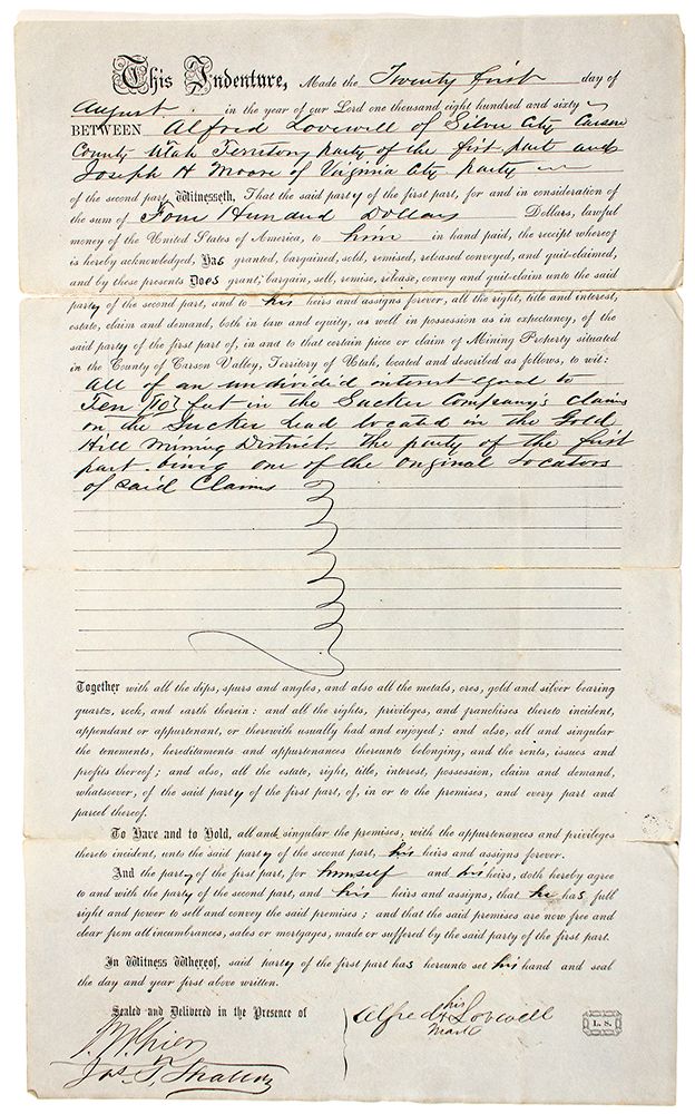 1860 Unusual and rare document. This hand-written and signed Deed dictates the sale of "10` in the Sucker Company`s Claims, Gold Hill Mining District, on August 21st, 1860, for the sum of $400.00." The reverse side, under the heading "Deed," is signed by "Alfred Lovewill To Jos H. Moon." A. Lovewill was from Silver City, and Mr. Moon was from Virginia City. At that time, both Silver City & Virginia City were in the Utah Territory. The Attorney listed at the bottom is Frank M. Pixley of Virginia City, U.T. who received fees of $3.00 for his services. FH believes this to be one of the earliest documents printed in Virginia City. Folded out, this document measures 14"x8.5". It is in good to very good condition, with tears in the fold creases. The Sucker Company of the Gold Hill Mining District later changed its name to the "Succor Gold & Silver Mining Company." - HKA#65193