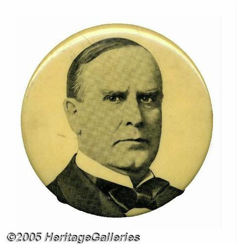 <B>Quite Unusual 4" McKinley Button</B></I> Filled metal back with folding wire easel as made. While this portrait is very common on various small-size buttons, we have never seen this hugh version before. Condition is excellent with one trivial light mark in the field off William McKinley's right ear lobe noted for accuracy. Lot:260