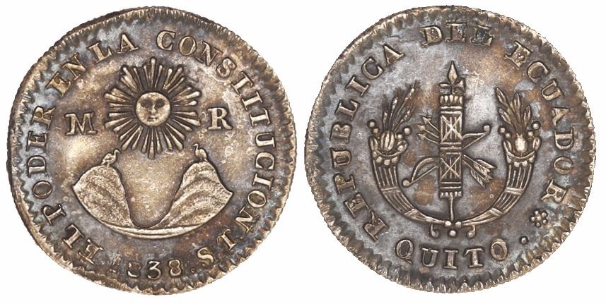 Quito, Ecuador, 1/2 real, 1838ST, ex-Glenn Gilman. 1.67 grams. Deeply struck and beautifully toned Mint State with minor rim damage below date, otherwise a worthy comparison with Dana Roberts' lovely MS63 that hammered at $2800. Two-year type. Pedigreed to the Glenn Gilman collection.