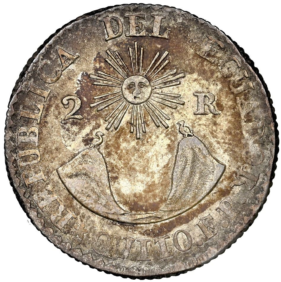 Quito, Ecuador, 2 reales, 1837 FP, transposed legends, rare, NGC AU 53, finest known in NGC census, ex-Lissner, ex-Wolfson. Seppa/Anderson-49; KM-21. Good strike with nearly full rims, traces of luster around details, but what really hits you are the big splashes of coppery toning, the coin described in Lissner (when it was AU 50) as "[the] only coin of this KM number ever graded by NGC" but now at the top of nine entries for this date (still the only listing for KM-21, with obverse legend on reverse and vice versa). Pedigreed to the R.L. Lissner Collection (stated on label, St. James's / CNG / Teller auction of August 2014, lot 1633), and to the Floyd E. Wolfson Collection (Superior auction of June 1975, lot 2062). Please use this link to verify the certification number