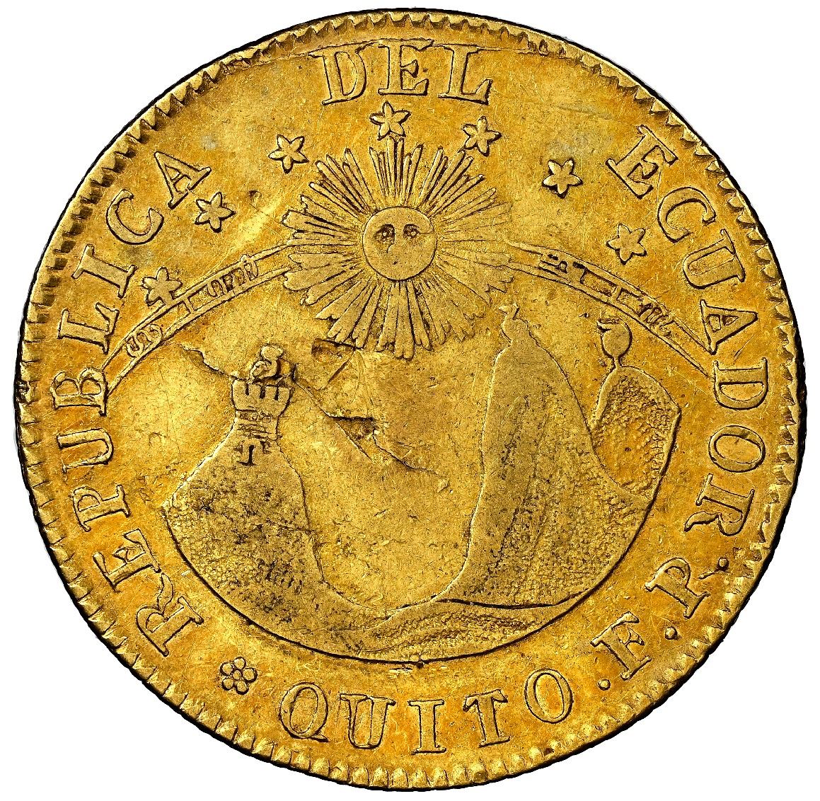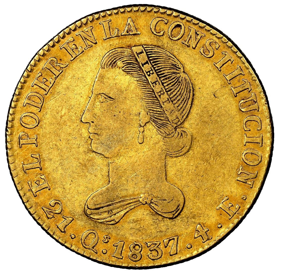 Quito, Ecuador, gold 4 escudos, 1837 FP, NGC XF 40. Seppa/Anderson-81; KM-19; Fr-4. Somewhat softly struck interiors and with lamination flaw in center of reverse, full rims, very lightly toned in legends. Please use this link to verify the certification number