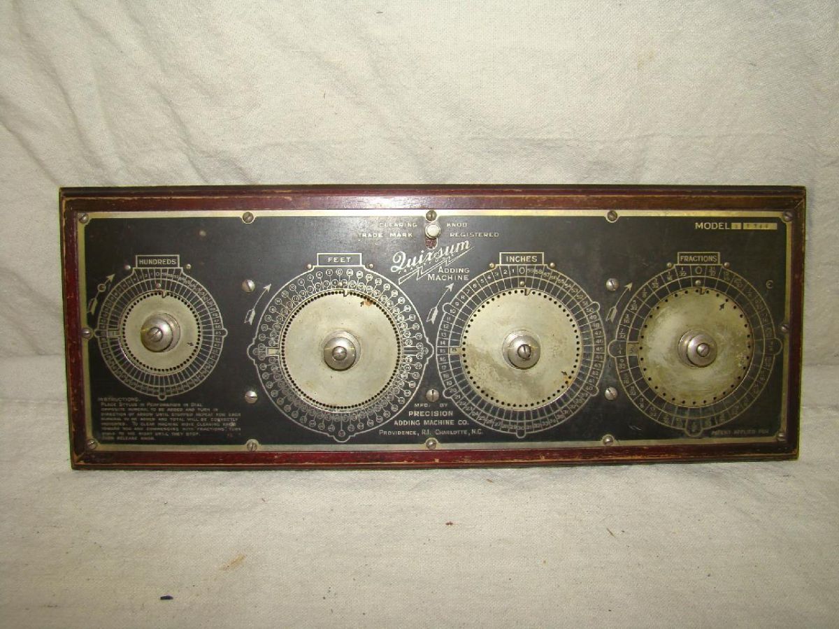 US patent June 10,, 1924. Large manual adder with four calculating disks.("Fractions", "Inches", "Feet", "Hundreds") Precision Adding Machine Co, Providence R.I. Approx. 15" x 5.75"