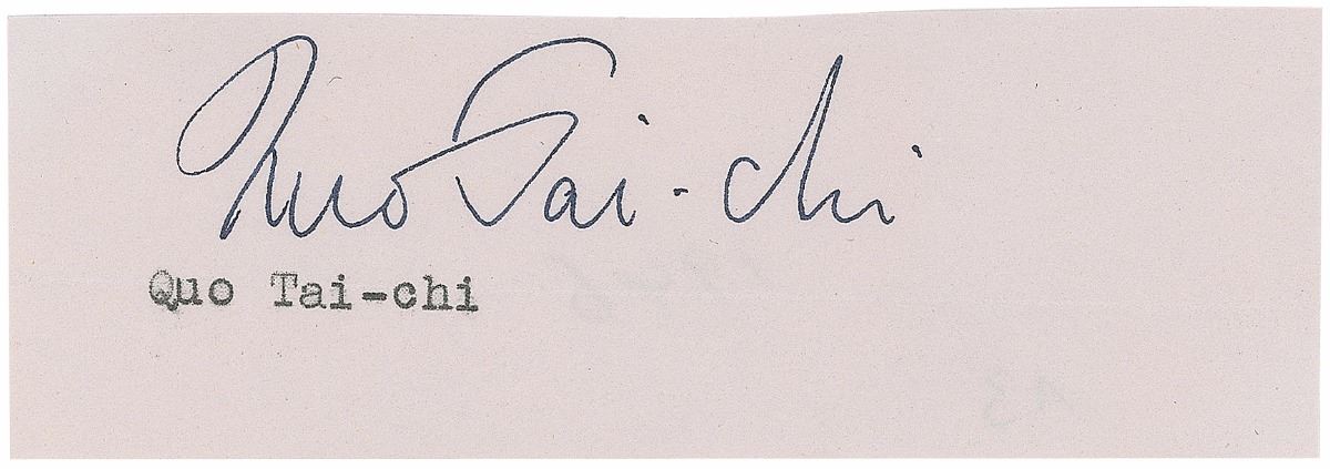 Chinese foreign minister (1889–1952) who served from 1941 to 1942, and was named as the permanent Chief Chinese Delegate to the United Nations in 1947. Crisp black ink signature, “Quo Tai-chi,” above his typed name, on an off-white 4.25 x 1.5 slip. In fine condition, with a slight horizontal crease (not affecting signature).