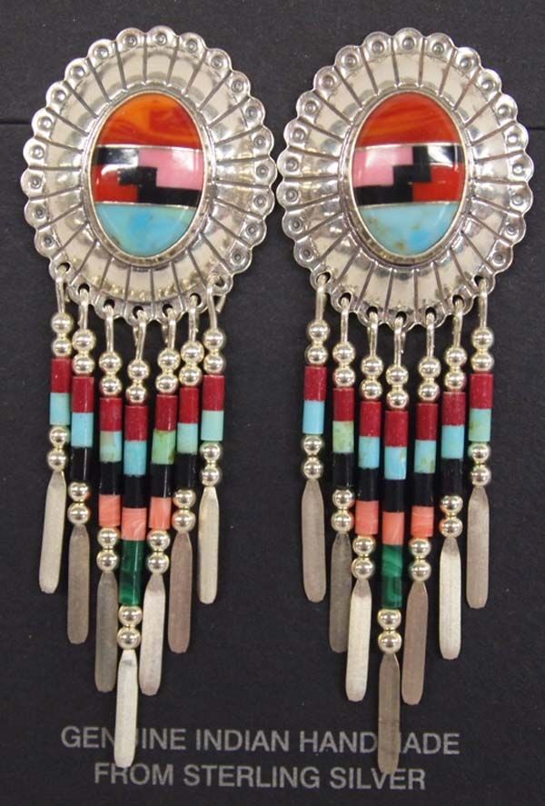 Quoc Turquoise Co. Southwestern Sterling Inlay Earrings, hallmarked QT for Q. T. Quoc Turquoise Inc. Albuquerque NM and stamped sterling measure 2.5''L x 1''W, each earring features sterling beaded dangles, hand stamping, and inlay cab of coral, red shell, turquoise, onyx, and pink coral, concho style design, beautiful colors, 10.22g in total wt.