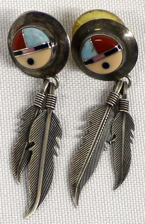 Quoc Turquoise Company Earrings, measures 1 7/8''L x .5'', inlay Sun Face and feather motif