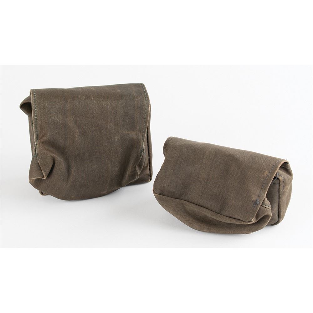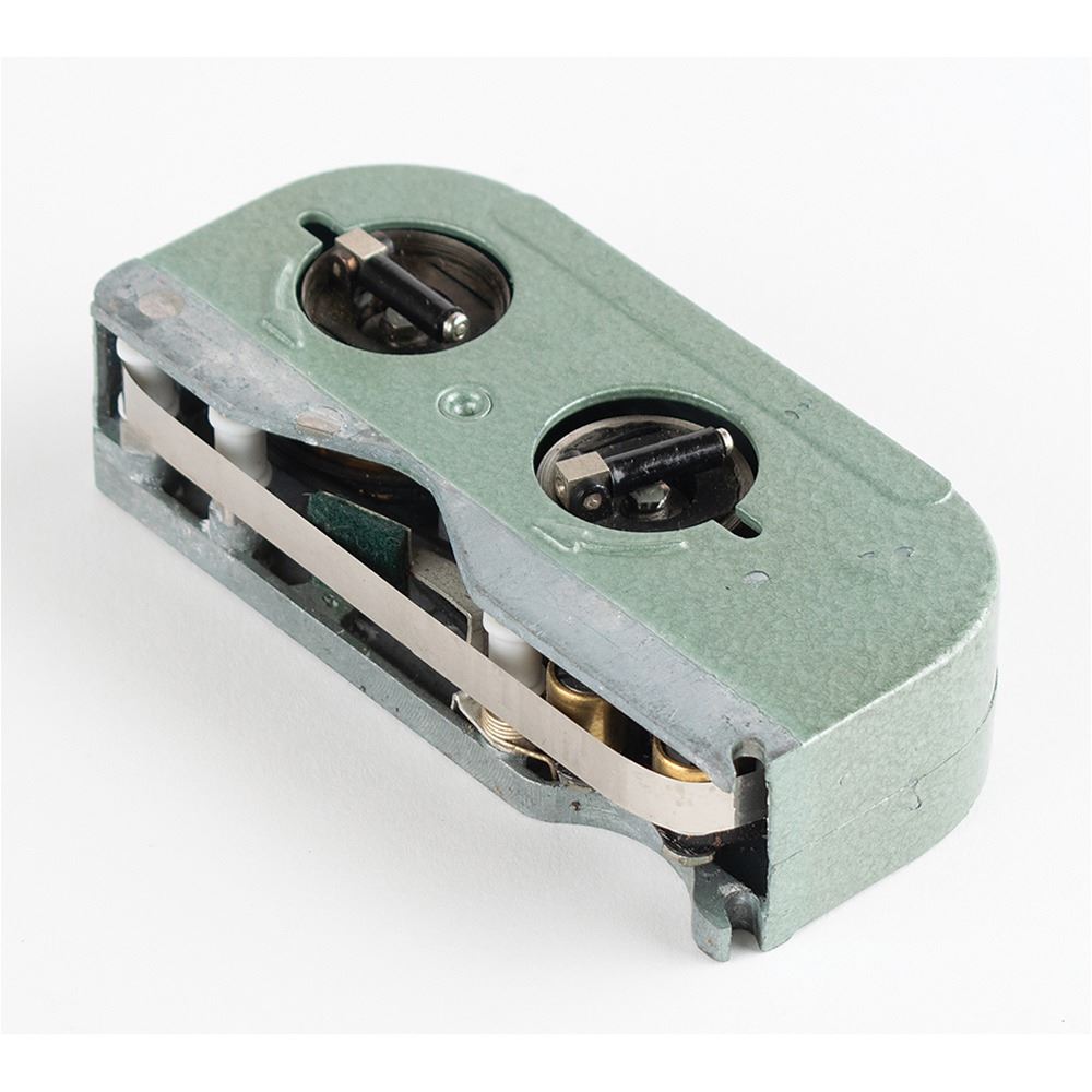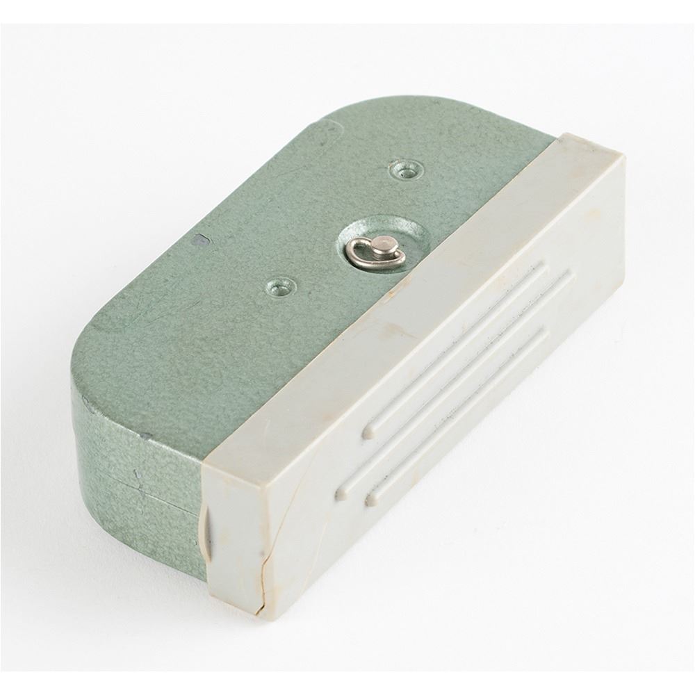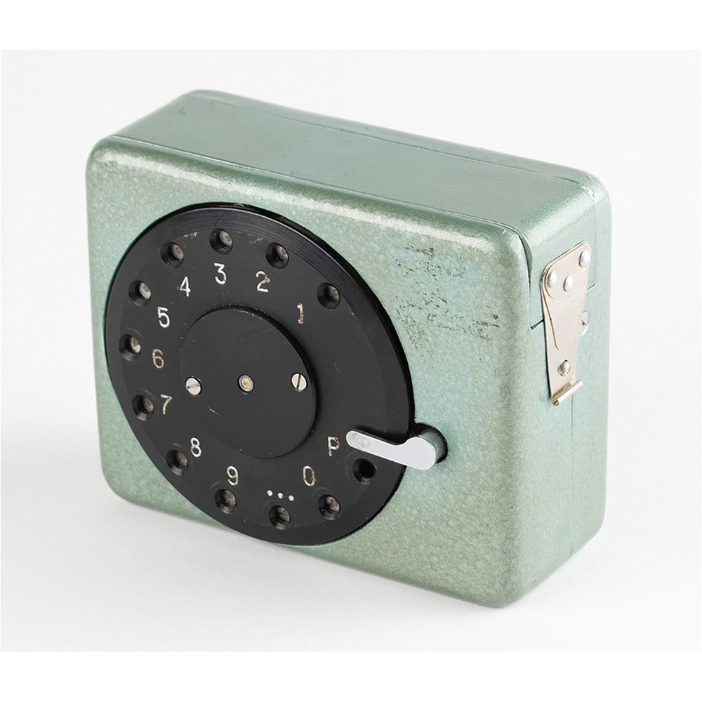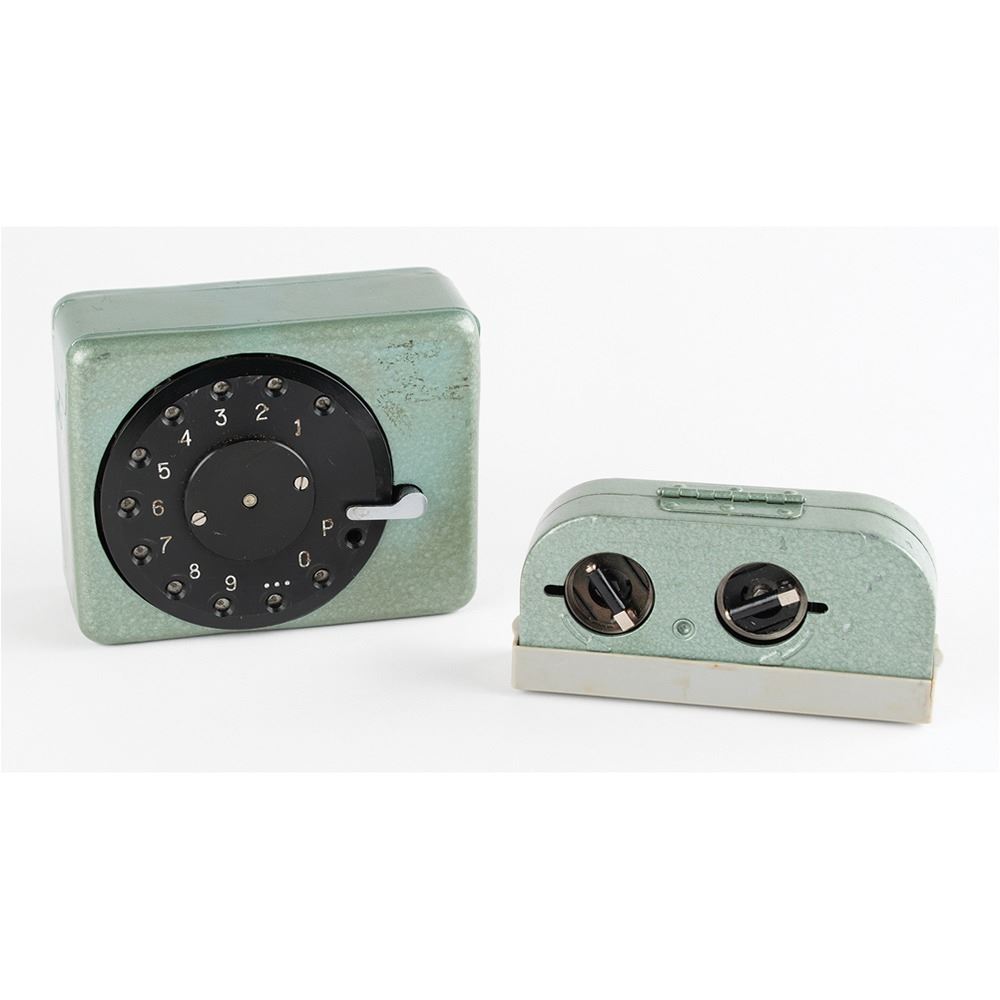 R-353 Proton burst encoder and magnetic tape cassette, introduced in the Soviet Union in 1969 as part of the R-353 spy radio set. The burst encoder measures approximately 4" x 3" x 1.5", and features a central black number dial similar to a rotary phone. Using a stylus stored inside the lid to rotate the dial, a message would be encoded onto magnetic tape. The tape cartridge measures 4" x 2" x 1" and has two small fold-out cranks for winding the tape on its internal spools. Both pieces are painted in the original green/blue hammerite paint, one of two colors used for the R-353 Proton spy radio set. Both include their canvas transport bags.