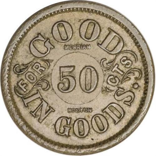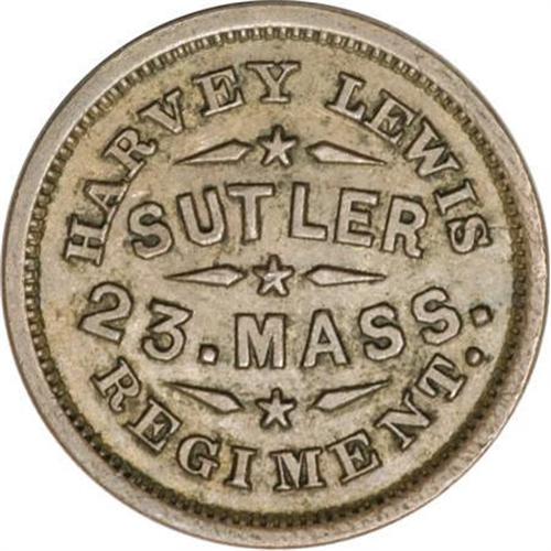 <B>R.6 Civil War Sutler 50 Cent Token.</B></I> Schenkman-B50C, R.6. Copper, 19 mm. A nice Extra Fine example of this Civil War token issued by <B>Harvey Lewis</B></I> for the 23rd Mass. Regiment. Dies by Joseph H. Merriam of Boston, who has his name on the reverse. <BR> <BR><BR><b>Shipping:</b> Coins & Currency (<a target="_blank" href="http://www.heritageauctions.com/common/shipping.php">view shipping information</a>)