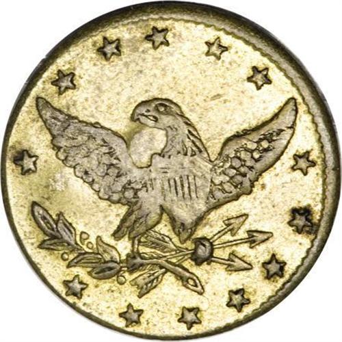 <B>R.7 Civil War Sutler 10 X Cent Token.</B></I> Schenkman-110Bb, R.7. Brass, 18 mm. A Choice AU Civil War token issued by <B>J.A. Garman, sutler</B></I> for the 54 PA. Vols, 10 X incused (reverse has spread eagle within circle of 13 stars). The incused X was added to stop enterprising soldiers from raising the value of the 10 cent tokens by adding a zero.<BR><BR><b>Shipping:</b> Coins & Currency (<a target="_blank" href="http://www.heritageauctions.com/common/shipping.php">view shipping information</a>)